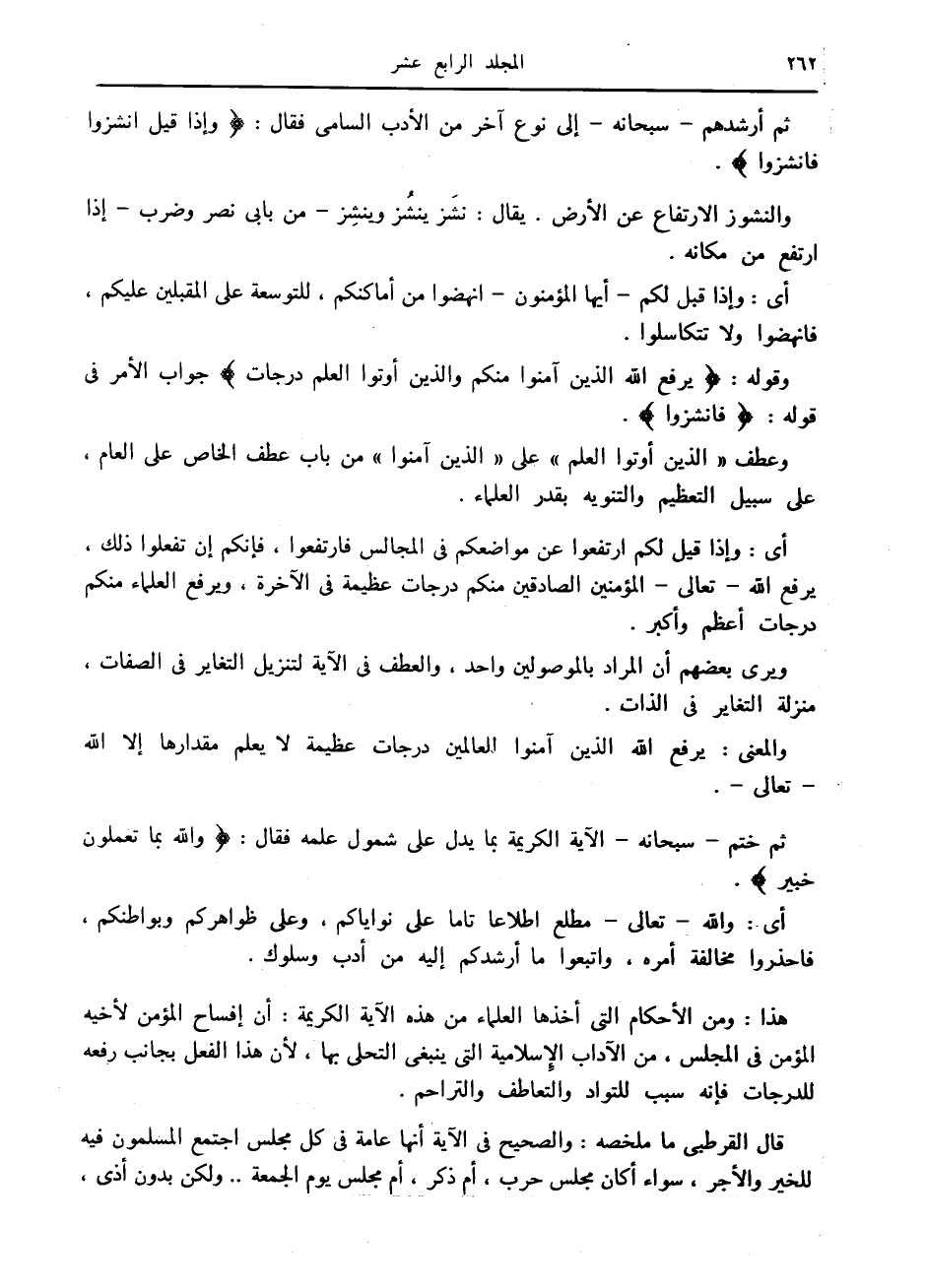 وقوله: يَرْفَعِ اللَّهُ الَّذِينَ آمَنُوا مِنْكُمْ وَالَّذِينَ أُوتُوا الْعِلْمَ دَرَجاتٍ جواب الأمر في قوله: فَانْشُزُوا.