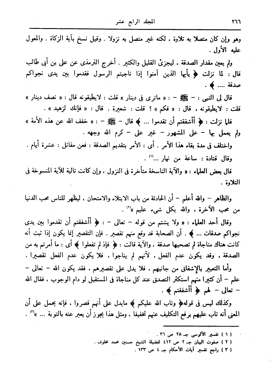 وقال أحد العلماء: «ولا يشتم من قوله- تعالى-: أَأَشْفَقْتُمْ أَنْ تُقَدِّمُوا بَيْنَ يَدَيْ نَجْواكُمْ صَدَقاتٍ.... أن الصحابة قد وقع منهم تقصير. فإن التقصير إنما يكون إذا ثبت أنه كانت هناك مناجاة لم تصحبها صدقة، والآية قالت: فَإِذْ لَمْ تَفْعَلُوا أى: ما أمرتم به من الصدقة، وقد يكون عدم الفعل، لأنهم لم يناجوا، فلا يكون عدم الفعل تقصيرا.