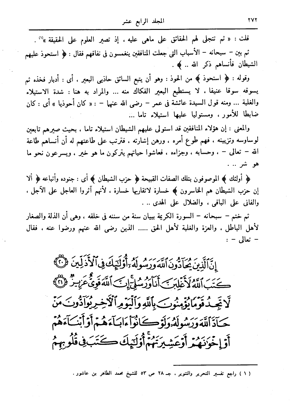 ثم ختم- سبحانه- السورة الكريمة ببيان سنة من سننه في خلقه، وهي أن الذلة والصغار لأهل الباطل، والعزة والغلبة لأهل الحق ... الذين رضى الله عنهم ورضوا عنه، فقال- تعالى-: