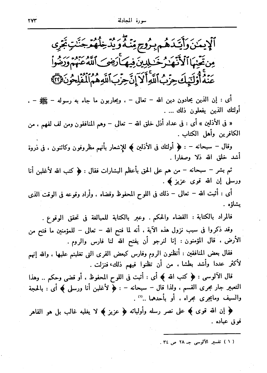 قال الآلوسى: كَتَبَ اللَّهُ أى: أثبت في اللوح المحفوظ، أو قضى وحكم.. وهذا التعبير جار مجرى القسم، ولذا قال- سبحانه-: لَأَغْلِبَنَّ أَنَا وَرُسُلِي أى: بالحجة والسيف وما يجرى مجراه، أو بأحدهما.. «1» .