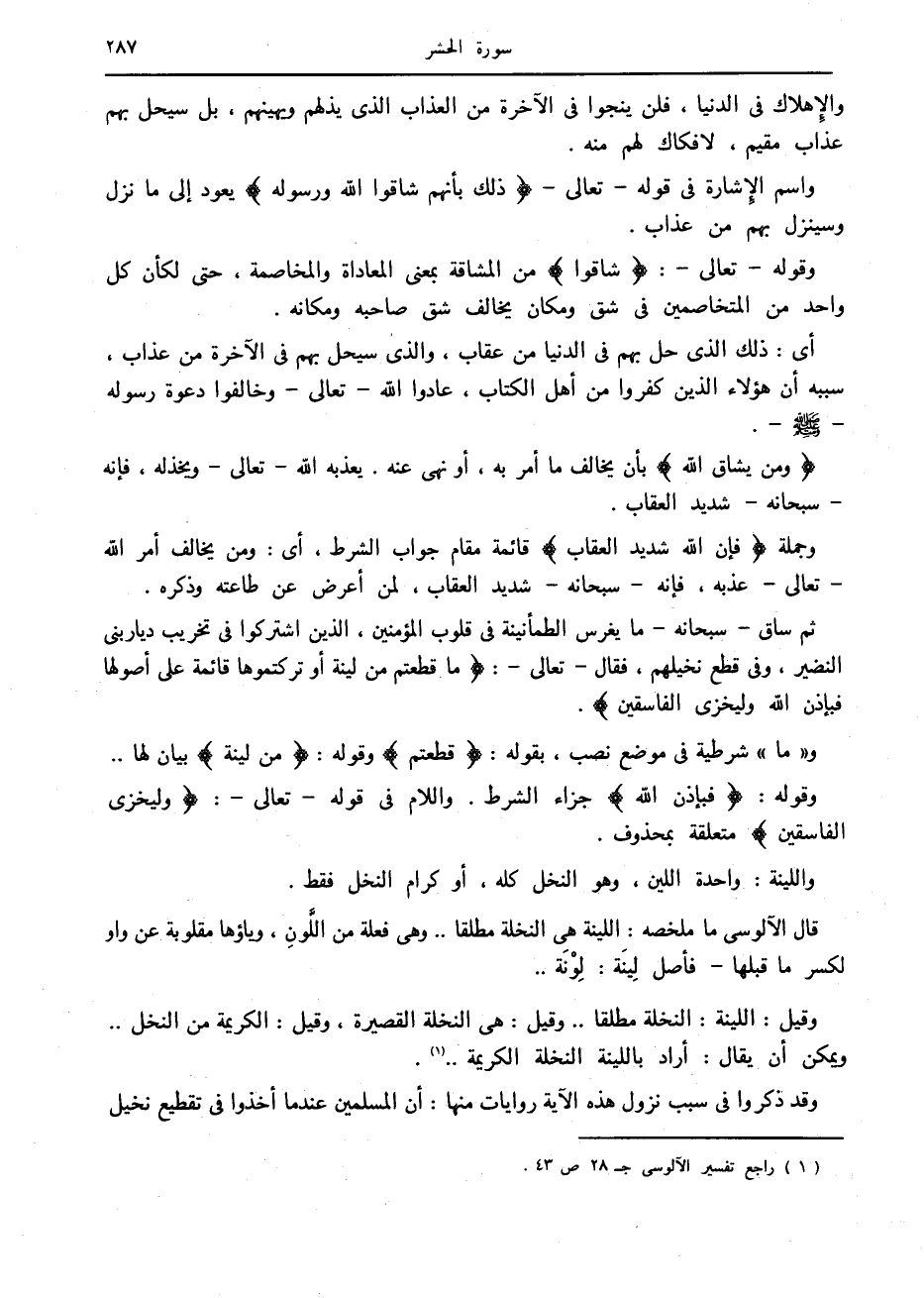 ثم ساق- سبحانه- ما يغرس الطمأنينة في قلوب المؤمنين، الذين اشتركوا في تخريب ديار بنى النضير، وفي قطع نخيلهم، فقال- تعالى-: ما قَطَعْتُمْ مِنْ لِينَةٍ أَوْ تَرَكْتُمُوها قائِمَةً عَلى أُصُولِها فَبِإِذْنِ اللَّهِ وَلِيُخْزِيَ الْفاسِقِينَ.