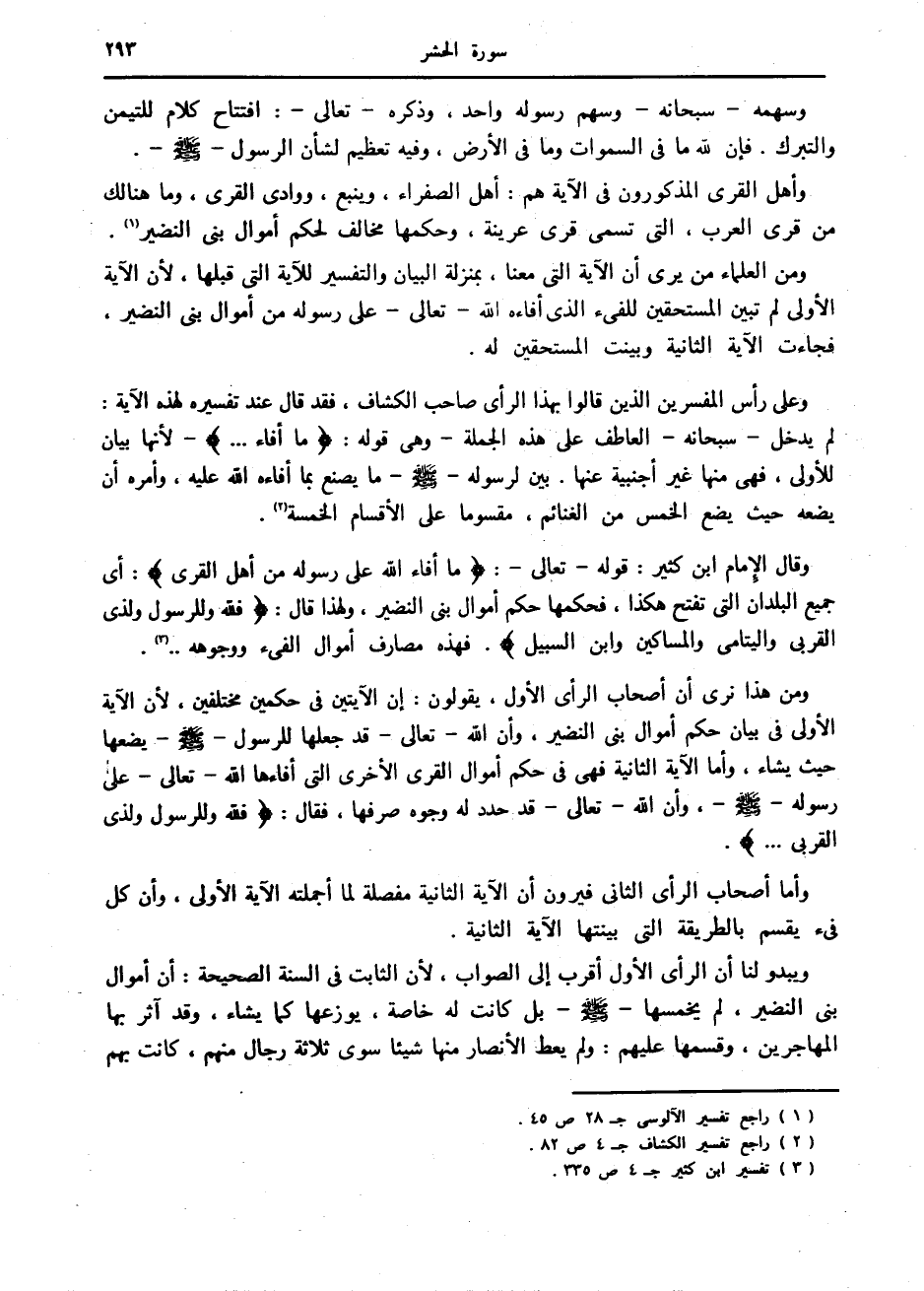 وقال الإمام ابن كثير: قوله- تعالى-: ما أَفاءَ اللَّهُ عَلى رَسُولِهِ مِنْ أَهْلِ الْقُرى: أى جميع البلدان التي تفتح هكذا، فحكمها حكم أموال بنى النضير، ولهذا قال: فَلِلَّهِ وَلِلرَّسُولِ وَلِذِي الْقُرْبى وَالْيَتامى وَالْمَساكِينِ وَابْنِ السَّبِيلِ. فهذه مصارف أموال الفيء ووجوهه.. «3» .