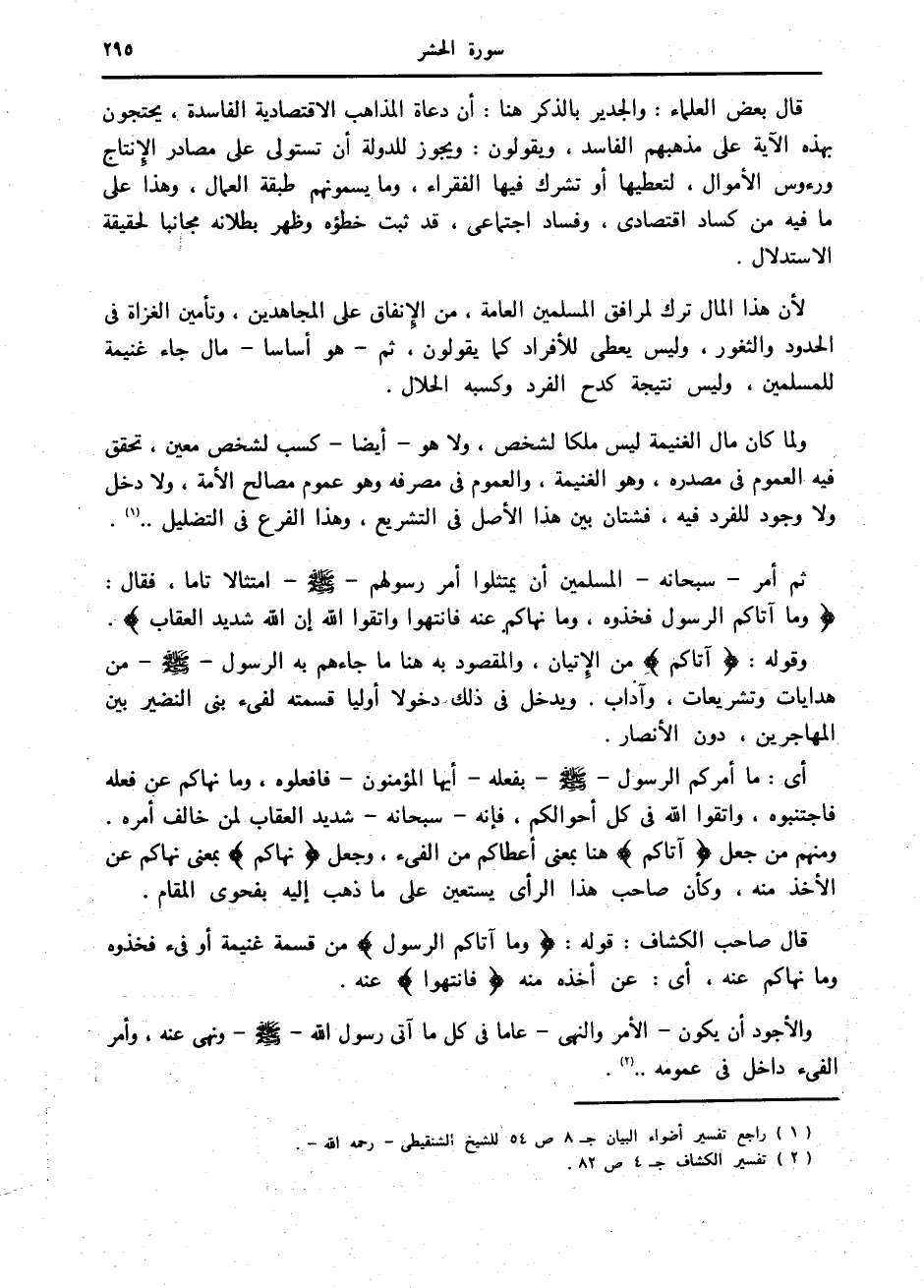 قال بعض العلماء: والجدير بالذكر هنا: أن دعاة المذاهب الاقتصادية الفاسدة، يحتجون بهذه الآية على مذهبهم الفاسد، ويقولون: ويجوز للدولة أن تستولى على مصادر الإنتاج ورءوس الأموال، لتعطيها أو تشرك فيها الفقراء، وما يسمونهم طبقة العمال، وهذا على ما فيه من كساد اقتصادى، وفساد اجتماعي، قد ثبت خطؤه وظهر بطلانه مجانبا لحقيقة الاستدلال.