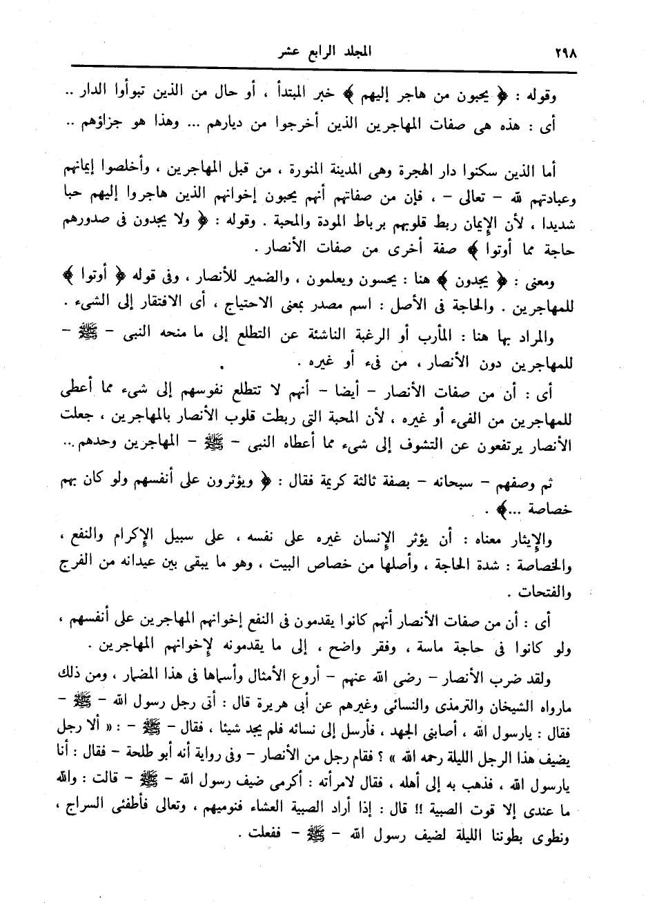ولقد ضرب الأنصار- رضى الله عنهم- أروع الأمثال وأسماها في هذا المضمار، ومن ذلك ما رواه الشيخان والترمذي والنسائي وغيرهم عن أبى هريرة قال: أتى رجل رسول الله صلى الله عليه وسلم فقال: يا رسول الله، أصابنى الجهد، فأرسل إلى نسائه فلم يجد شيئا، فقال صلى الله عليه وسلم: «ألا رجل يضيف هذا الرجل الليلة رحمه الله» ؟ فقال رجل من الأنصار- وفي رواية أنه أبو طلحة- فقال: أنا يا رسول الله، فذهب به إلى أهله، فقال لامرأته: أكرمى ضيف رسول الله صلى الله عليه وسلم قالت: والله ما عندي إلا قوت الصبية!! قال: إذا أراد الصبية العشاء فنوميهم، وتعالى فأطفئى السراج، ونطوى بطوننا الليلة لضيف رسول الله صلى الله عليه وسلم ففعلت.