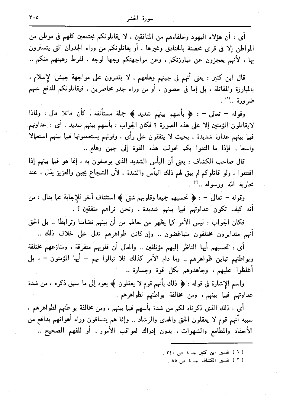 قال صاحب الكشاف: يعنى أن البأس الشديد الذي يوصفون به، إنما هو فيما بينهم إذا اقتتلوا، ولو قاتلوكم لم يبق لهم ذلك البأس والشدة، لأن الشجاع يجبن والعزيز يذل، عند محاربة الله ورسوله.. «2» .