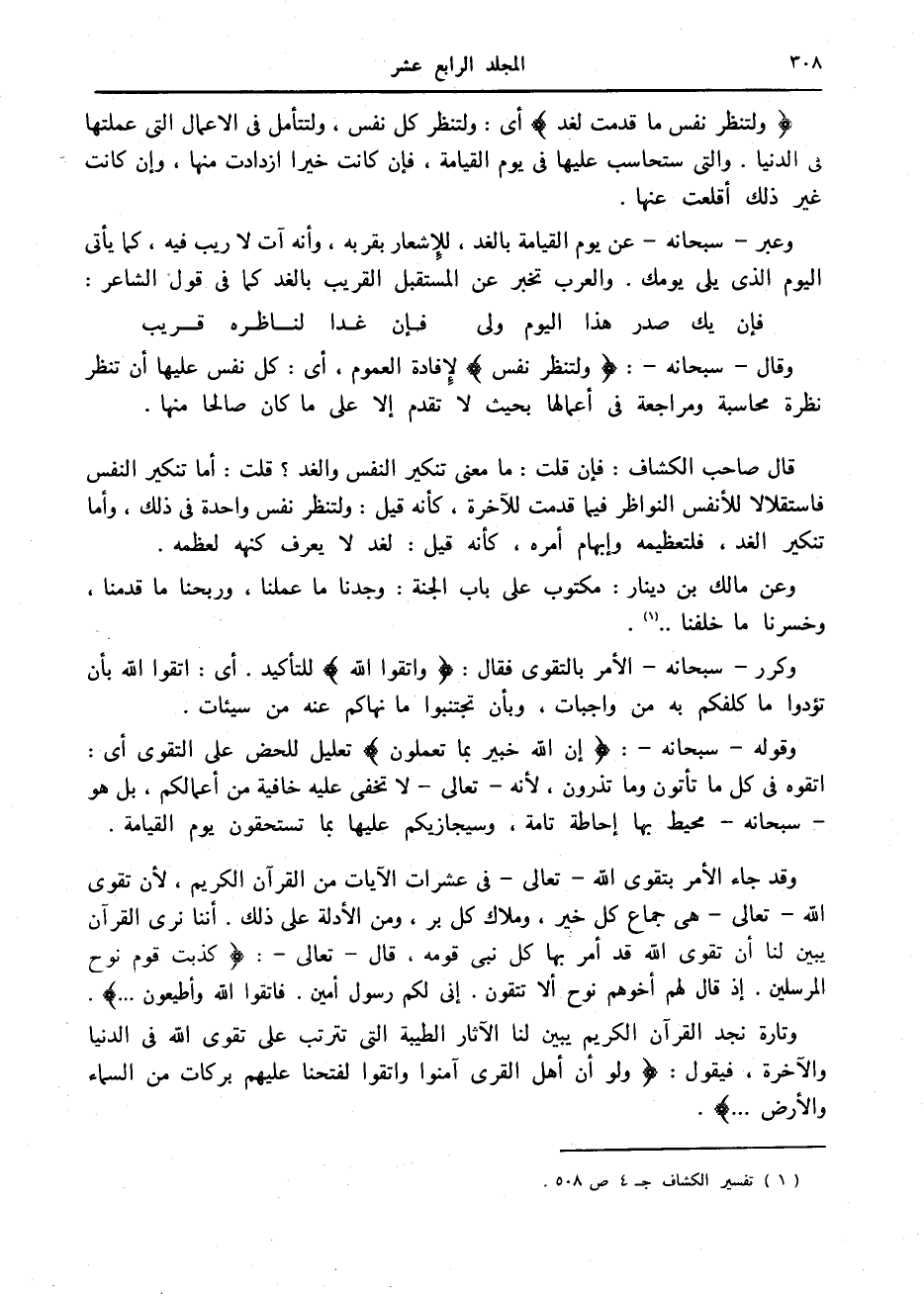 وقال- سبحانه-: وَلْتَنْظُرْ نَفْسٌ لإفادة العموم، أى: كل نفس عليها أن تنظر نظرة محاسبة ومراجعة في أعمالها بحيث لا تقدم إلا على ما كان صالحا منها.