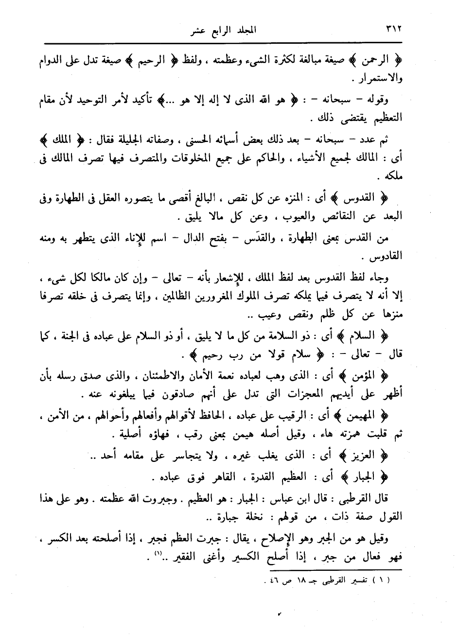 الْقُدُّوسُ أى: المنزه عن كل نقص، البالغ أقصى ما يتصوره العقل في الطهارة وفي البعد عن النقائص والعيوب، وعن كل ما لا يليق.