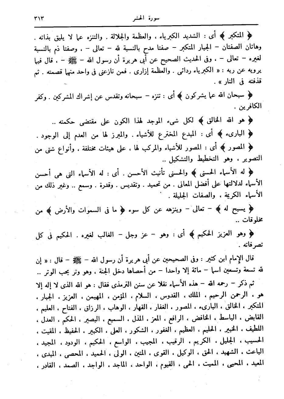 ثم ذكر- رحمه الله- هذه الأسماء نقلا عن سنن الترمذي فقال: هو الله الذي لا إله إلا هو، الرحمن الرحيم، الملك، القدوس، السلام، المؤمن، المهيمن، العزيز، الجبار، المتكبر، الخالق، البارئ، المصور، الغفار، القهار، الوهاب، الرزاق، الفتاح، العليم، القابض، الباسط، الخافض، الرافع، المعز، المذل، السميع، البصير، الحكم، العدل، اللطيف، الخبير، الحليم، العظيم، الغفور، الشكور، العلى، الكبير، الحفيظ، المقيت، الحسيب، الجليل، الكريم، الرقيب، المجيب، الواسع، الحكيم، الودود، المجيد، الباعث، الشهيد، الحق، الوكيل، القوى، المتين، الولي، الحميد، المحصى، المبدئ، المعيد، المحيي، المميت، الحي، القيوم، الواحد، الماجد، الواجد، الصمد، القادر،