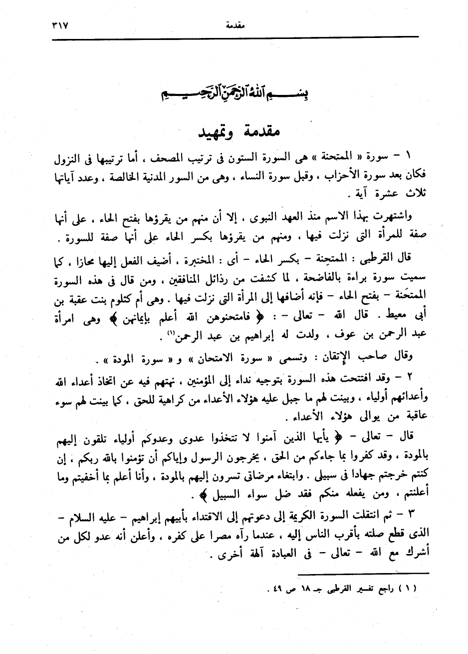 1- سورة «الممتحنة» هي السورة الستون في ترتيب المصحف، أما ترتيبها في النزول فكان بعد سورة الأحزاب، وقبل سورة النساء، وهي من السور المدنية الخالصة، وعدد آياتها ثلاث عشرة آية.