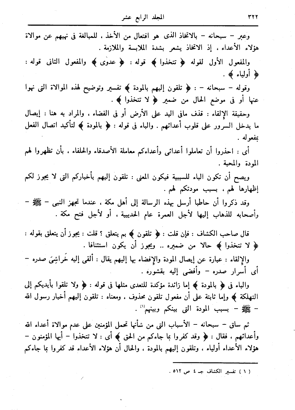 والباء في بِالْمَوَدَّةِ إما زائدة مؤكدة للتعدى مثلها في قوله: وَلا تُلْقُوا بِأَيْدِيكُمْ إِلَى التَّهْلُكَةِ وإما ثابتة على أن مفعول تلقون محذوف، ومعناه: تلقون إليهم أخبار رسول الله صلى الله عليه وسلم بسبب المودة التي بينكم وبينهم «1» .