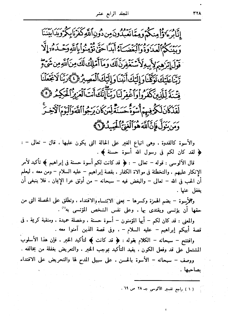 قَدْ كانَتْ لَكُمْ أُسْوَةٌ حَسَنَةٌ فِي إِبْراهِيمَ وَالَّذِينَ مَعَهُ إِذْ قالُوا لِقَوْمِهِمْ إِنَّا بُرَآؤُا مِنْكُمْ وَمِمَّا تَعْبُدُونَ مِنْ دُونِ اللَّهِ كَفَرْنا بِكُمْ وَبَدا بَيْنَنا وَبَيْنَكُمُ الْعَداوَةُ وَالْبَغْضاءُ أَبَداً حَتَّى تُؤْمِنُوا بِاللَّهِ وَحْدَهُ إِلاَّ قَوْلَ إِبْراهِيمَ لِأَبِيهِ لَأَسْتَغْفِرَنَّ لَكَ وَما أَمْلِكُ لَكَ مِنَ اللَّهِ مِنْ شَيْءٍ رَبَّنا عَلَيْكَ تَوَكَّلْنا وَإِلَيْكَ أَنَبْنا وَإِلَيْكَ الْمَصِيرُ (4) رَبَّنا لا تَجْعَلْنا فِتْنَةً لِلَّذِينَ كَفَرُوا وَاغْفِرْ لَنا رَبَّنا إِنَّكَ أَنْتَ الْعَزِيزُ الْحَكِيمُ (5) لَقَدْ كانَ لَكُمْ فِيهِمْ أُسْوَةٌ حَسَنَةٌ لِمَنْ كانَ يَرْجُوا اللَّهَ وَالْيَوْمَ الْآخِرَ وَمَنْ يَتَوَلَّ فَإِنَّ اللَّهَ هُوَ الْغَنِيُّ الْحَمِيدُ (6)