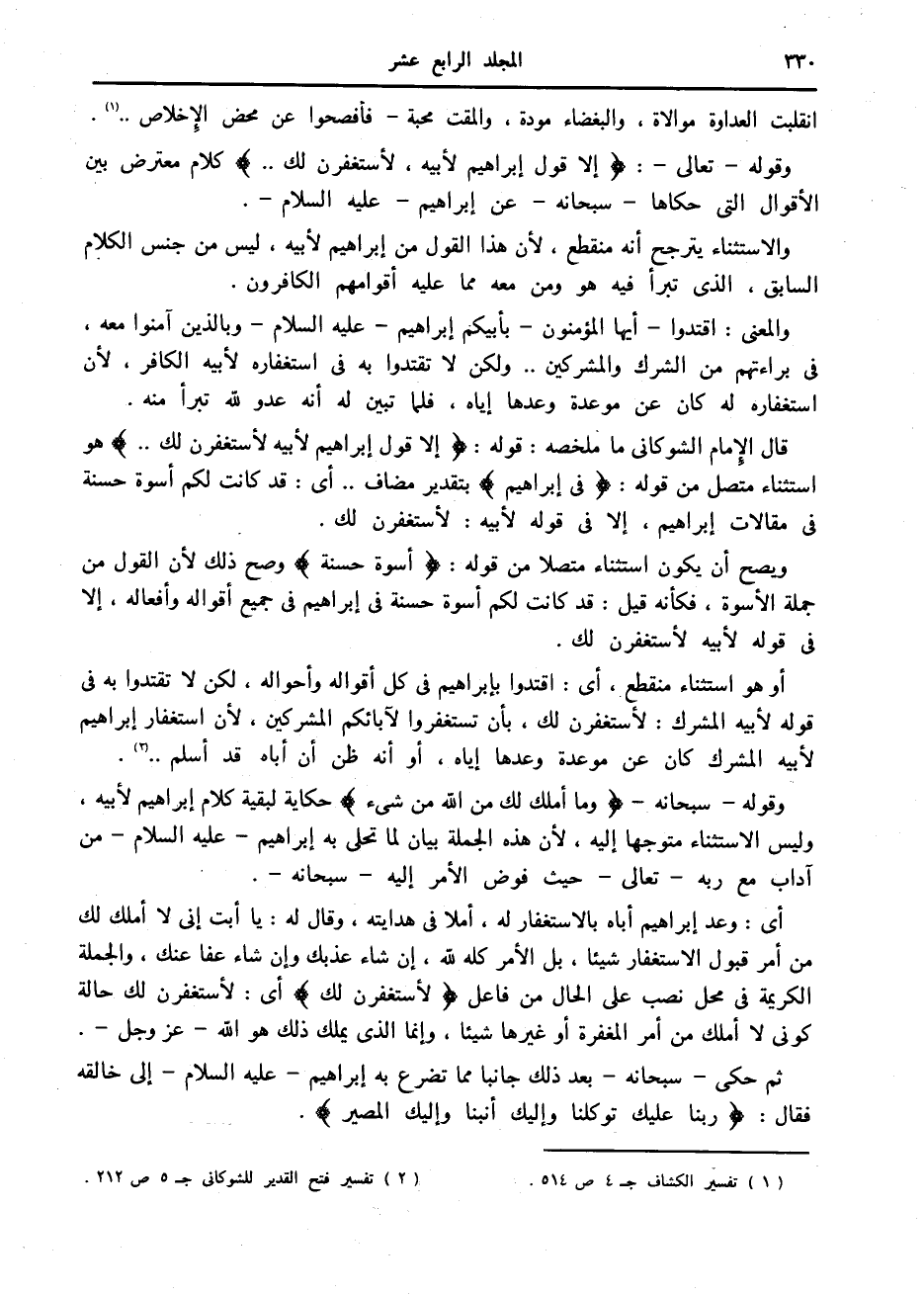 قال الإمام الشوكانى ما ملخصه: قوله: إِلَّا قَوْلَ إِبْراهِيمَ لِأَبِيهِ لَأَسْتَغْفِرَنَّ لَكَ.. هو استثناء متصل من قوله: فِي إِبْراهِيمَ بتقدير مضاف.. أى: قد كانت لكم أسوة حسنة في مقالات إبراهيم، إلا في قوله لأبيه: لأستغفرن لك.