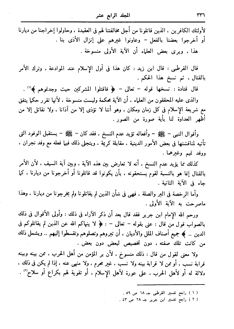قال القرطبي: قال ابن زيد: كان هذا في أول الإسلام عند الموادعة، وترك الأمر بالقتال، ثم نسخ هذا الحكم.