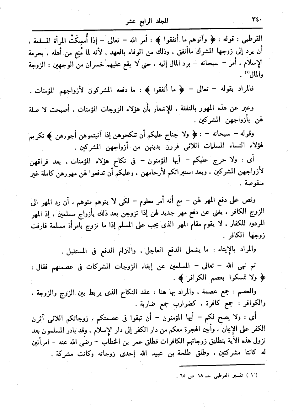 القرطبي: قوله: وَآتُوهُمْ ما أَنْفَقُوا: أمر الله- تعالى- إذا أمسكت المرأة المسلمة، أن يرد إلى زوجها المشرك ما أنفق، وذلك من الوفاء بالعهد، لأنه لما منع من أهله، بحرمة الإسلام، أمر- سبحانه- برد المال إليه، حتى لا يقع عليهم خسران من الوجهين: الزوجة والمال «1» .