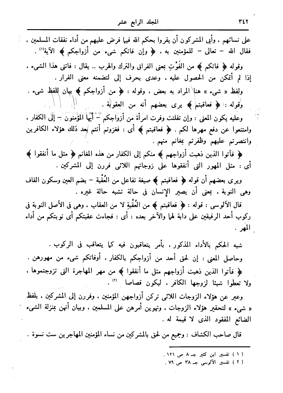 على نسائهم، وأبى المشركون أن يقروا بحكم الله فيما فرض عليهم من أداء نفقات المسلمين، فقال الله- تعالى- للمؤمنين به، وَإِنْ فاتَكُمْ شَيْءٌ مِنْ أَزْواجِكُمْ الآية «1» .