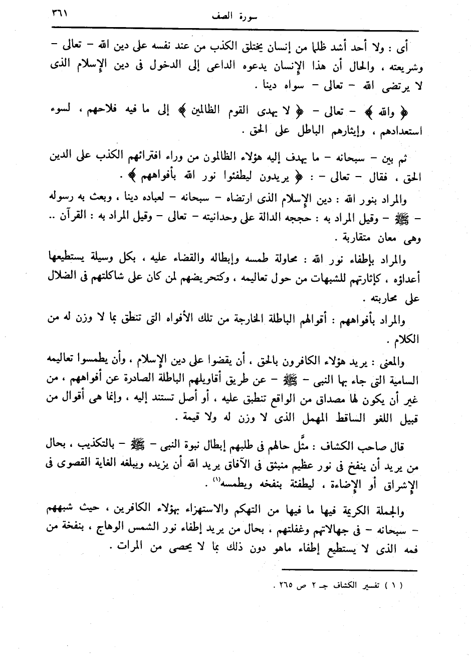 قال صاحب الكشاف: مثّل حالهم في طلبهم إبطال نبوة النبي صلى الله عليه وسلم بالتكذيب، بحال من يريد أن ينفخ في نور عظيم منبثق في الآفاق يريد الله أن يزيده ويبلغه الغاية القصوى في الإشراق أو الإضاءة، ليطفئه بنفخه ويطمسه «1» .