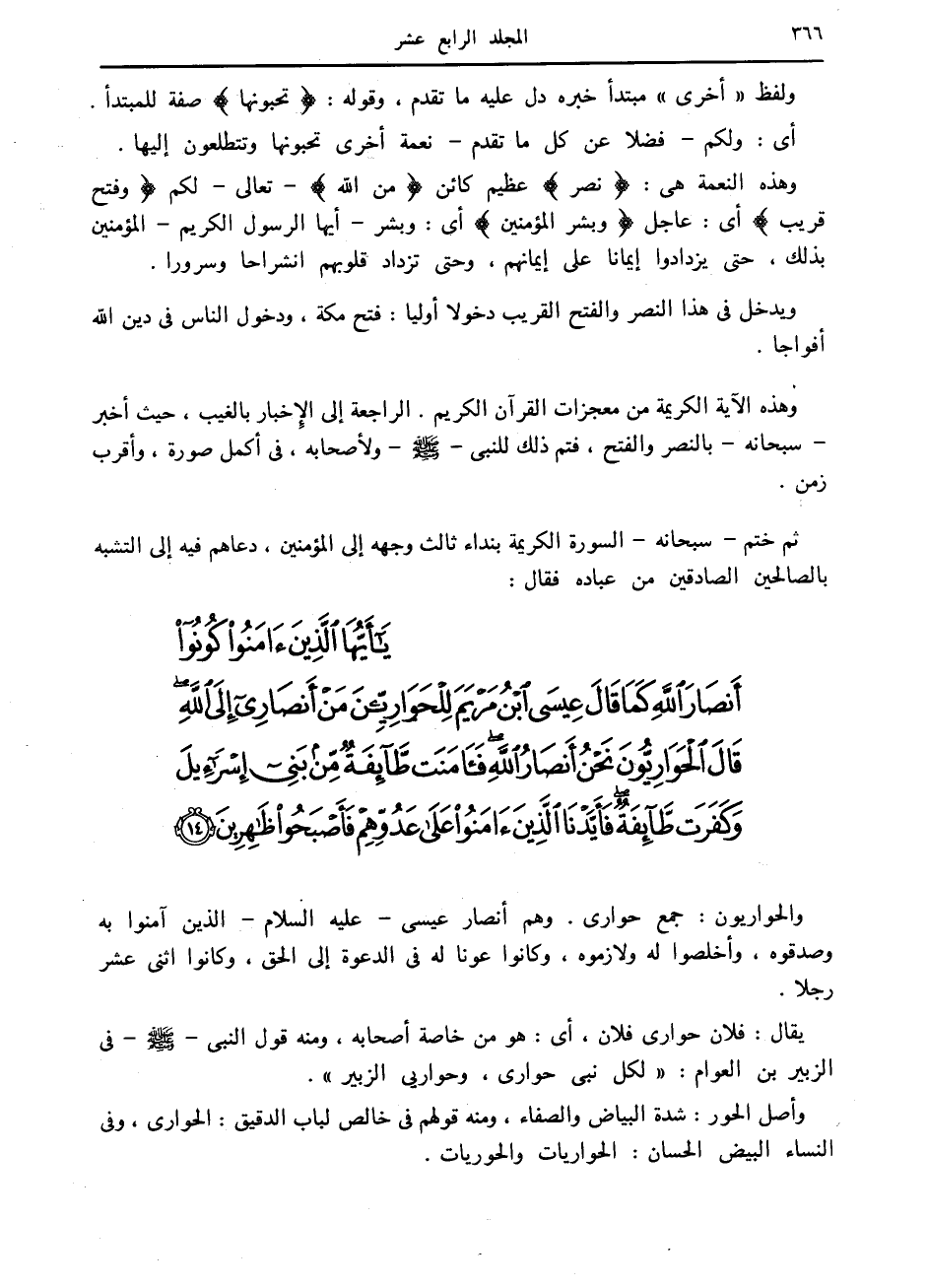 يا أَيُّهَا الَّذِينَ آمَنُوا كُونُوا أَنْصارَ اللَّهِ كَما قالَ عِيسَى ابْنُ مَرْيَمَ لِلْحَوارِيِّينَ مَنْ أَنْصارِي إِلَى اللَّهِ قالَ الْحَوارِيُّونَ نَحْنُ أَنْصارُ اللَّهِ فَآمَنَتْ طائِفَةٌ مِنْ بَنِي إِسْرائِيلَ وَكَفَرَتْ طائِفَةٌ فَأَيَّدْنَا الَّذِينَ آمَنُوا عَلى عَدُوِّهِمْ فَأَصْبَحُوا ظاهِرِينَ (14)