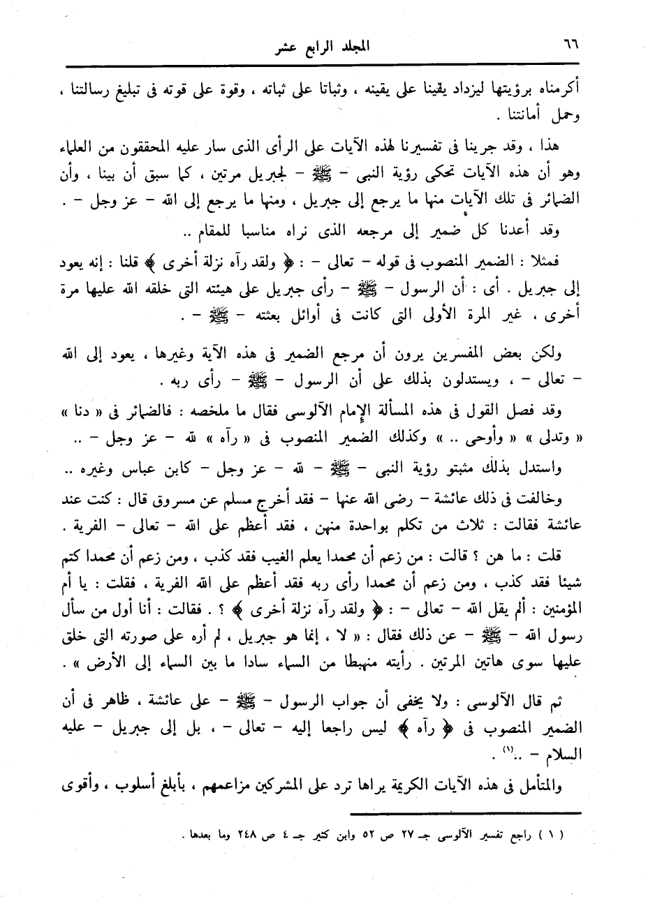 ثم قال الآلوسى: ولا يخفى أن جواب الرسول صلى الله عليه وسلم على عائشة، ظاهر في أن الضمير المنصوب في رَآهُ ليس راجعا إليه- تعالى-، بل إلى جبريل- عليه السلام-.. «1» .