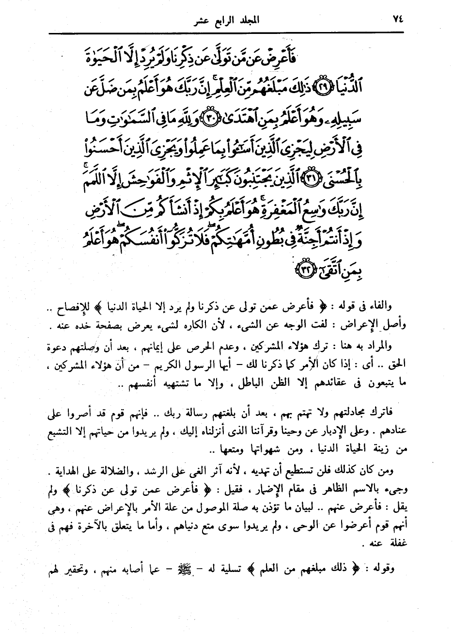 فَأَعْرِضْ عَنْ مَنْ تَوَلَّى عَنْ ذِكْرِنا وَلَمْ يُرِدْ إِلاَّ الْحَياةَ الدُّنْيا (29) ذلِكَ مَبْلَغُهُمْ مِنَ الْعِلْمِ إِنَّ رَبَّكَ هُوَ أَعْلَمُ بِمَنْ ضَلَّ عَنْ سَبِيلِهِ وَهُوَ أَعْلَمُ بِمَنِ اهْتَدى (30) وَلِلَّهِ ما فِي السَّماواتِ وَما فِي الْأَرْضِ لِيَجْزِيَ الَّذِينَ أَساؤُا بِما عَمِلُوا وَيَجْزِيَ الَّذِينَ أَحْسَنُوا بِالْحُسْنَى (31) الَّذِينَ يَجْتَنِبُونَ كَبائِرَ الْإِثْمِ وَالْفَواحِشَ إِلاَّ اللَّمَمَ إِنَّ رَبَّكَ واسِعُ الْمَغْفِرَةِ هُوَ أَعْلَمُ بِكُمْ إِذْ أَنْشَأَكُمْ مِنَ الْأَرْضِ وَإِذْ أَنْتُمْ أَجِنَّةٌ فِي بُطُونِ أُمَّهاتِكُمْ فَلا تُزَكُّوا أَنْفُسَكُمْ هُوَ أَعْلَمُ بِمَنِ اتَّقى (32)