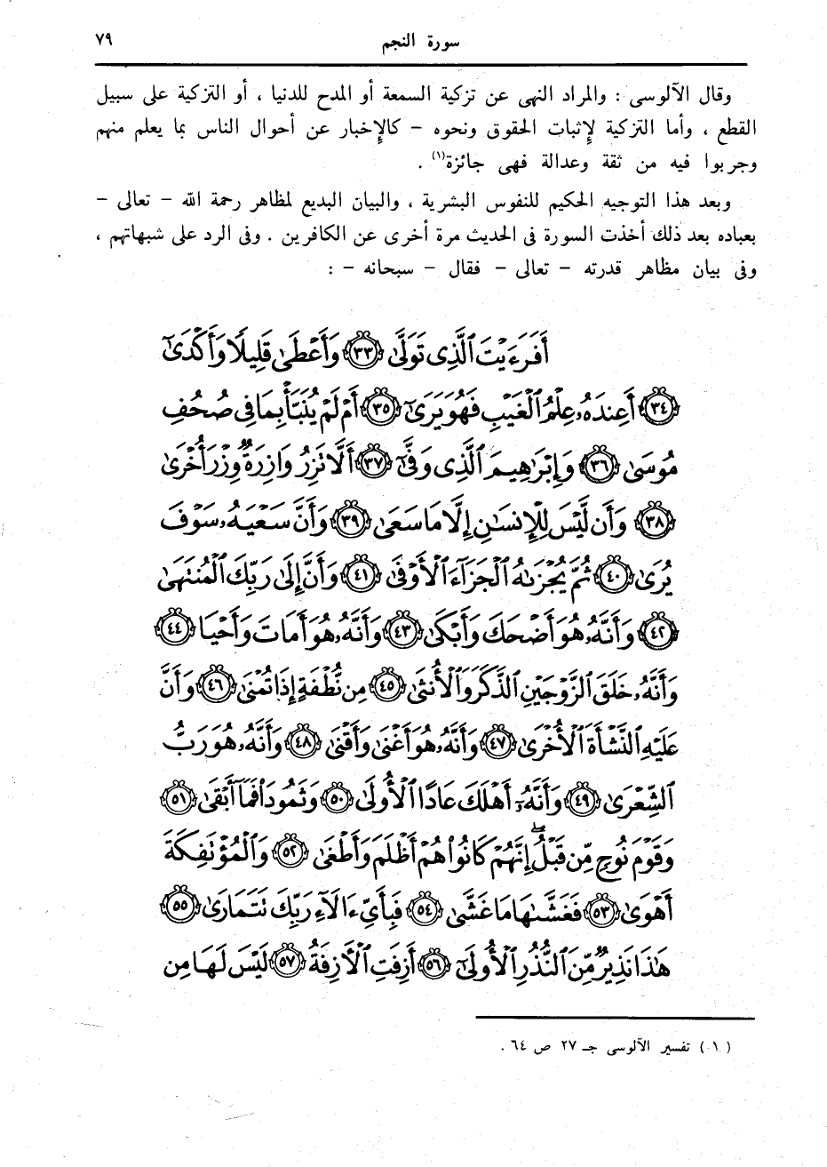 أَفَرَأَيْتَ الَّذِي تَوَلَّى (33) وَأَعْطى قَلِيلاً وَأَكْدى (34) أَعِنْدَهُ عِلْمُ الْغَيْبِ فَهُوَ يَرى (35) أَمْ لَمْ يُنَبَّأْ بِما فِي صُحُفِ مُوسى (36) وَإِبْراهِيمَ الَّذِي وَفَّى (37)