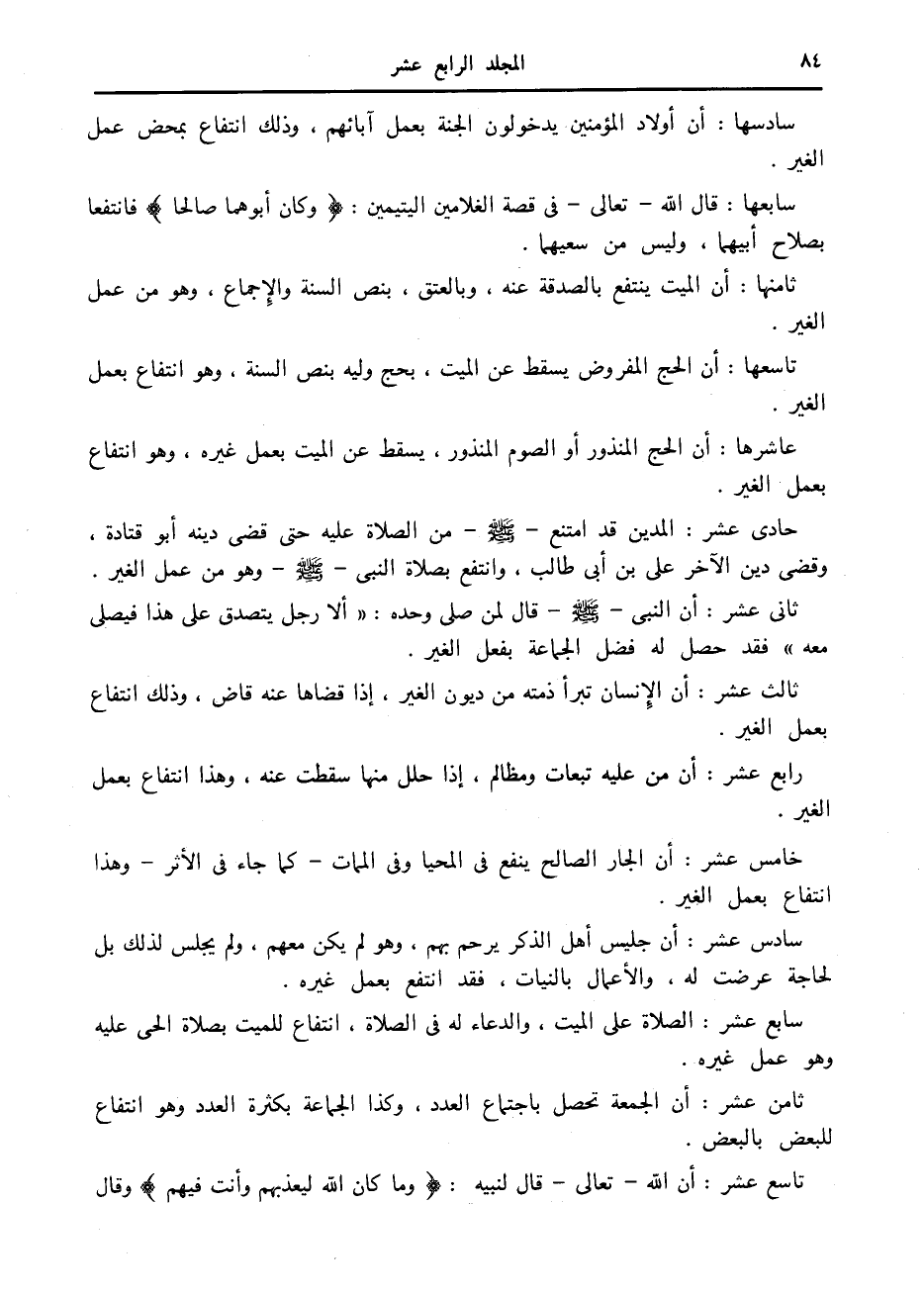 ثامنها: أن الميت ينتفع بالصدقة عنه، وبالعتق، بنص السنة والإجماع، وهو من عمل الغير.