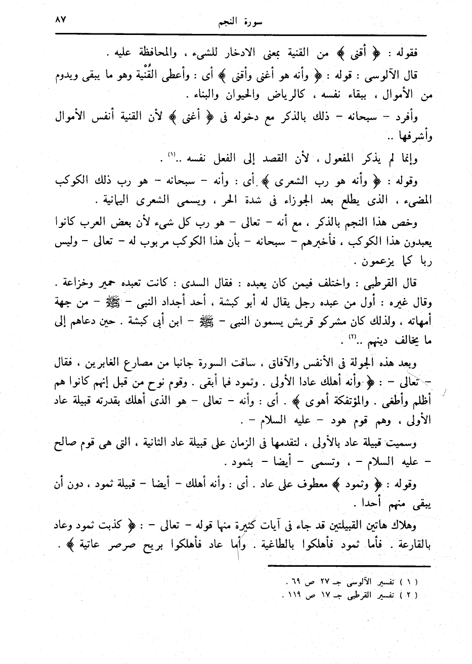 وبعد هذه الجولة في الأنفس والآفاق، ساقت السورة جانبا من مصارع الغابرين، فقال- تعالى-: وَأَنَّهُ أَهْلَكَ عاداً الْأُولى. وَثَمُودَ فَما أَبْقى. وَقَوْمَ نُوحٍ مِنْ قَبْلُ إِنَّهُمْ كانُوا هُمْ أَظْلَمَ وَأَطْغى. وَالْمُؤْتَفِكَةَ أَهْوى. أى: وأنه- تعالى- هو الذي أهلك بقدرته قبيلة عاد الأولى، وهم قوم هود- عليه السلام-.