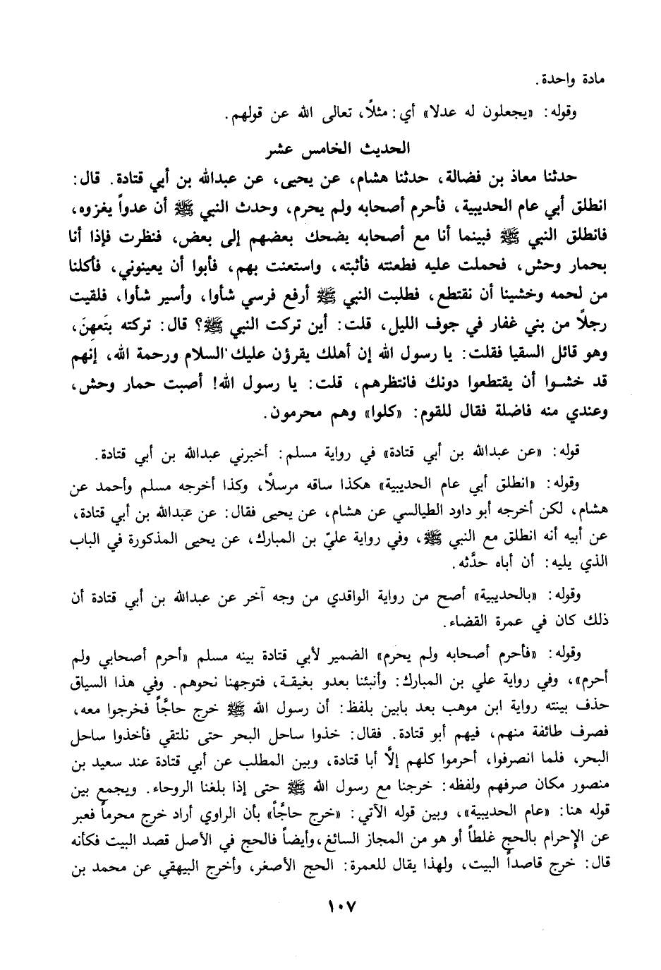 حَدَّثَنَا مُعَاذُ بْنُ فَضَالَةَ، حَدَّثَنَا هِشَامٌ، عَنْ يَحْيَى، عَنْ عَبْدِ اللَّهِ بْنِ أَبِي قَتَادَةَ قَالَ: انْطَلَقَ أَبِي عَامَ الْحُدَيْبِيَةِ فَأَحْرَمَ أَصْحَابُهُ، وَلَمْ يُحْرِمْ، وَحُدِّثَ النَّبِيُّ -صلى الله عليه وسلم- أَنَّ عَدُوًّا يَغْزُوهُ، فَانْطَلَقَ النَّبِيُّ -صلى الله عليه وسلم-، فَبَيْنَمَا أَنَا مَعَ أَصْحَابِهِ يَضْحَكُ بَعْضُهُمْ إِلَى بَعْضٍ، فَنَظَرْتُ فَإِذَا أَنَا بِحِمَارِ وَحْشٍ، فَحَمَلْتُ عَلَيْهِ، فَطَعَنْتُهُ، فَأَثْبَتُّهُ، وَاسْتَعَنْتُ بِهِمْ، فَأَبَوْا أَنْ يُعِينُونِي، فَأَكَلْنَا مِنْ لَحْمِهِ، وَخَشِينَا أَنْ نُقْتَطَعَ، فَطَلَبْتُ النَّبِيَّ -صلى الله عليه وسلم- أَرْفَعُ فَرَسِي شَأْوًا، وَأَسِيرُ شَأْوًا، فَلَقِيتُ رَجُلاً مِنْ بَنِي غِفَارٍ فِي جَوْفِ اللَّيْلِ قُلْتُ: أَيْنَ تَرَكْتَ النَّبِيَّ -صلى الله عليه وسلم-؟ قَالَ: تَرَكْتُهُ بِتَعْهِنَ، وَهُوَ قَائِلٌ السُّقْيَا. فَقُلْتُ: يَا رَسُولَ اللَّهِ إِنَّ أَهْلَكَ يَقْرَءُونَ عَلَيْكَ السَّلاَمَ وَرَحْمَةَ اللَّهِ، إِنَّهُمْ قَدْ خَشُوا أَنْ يُقْتَطَعُوا دُونَكَ، فَانْتَظِرْهُمْ قُلْتُ: يَا رَسُولَ اللَّهِ أَصَبْتُ حِمَارَ وَحْشٍ، وَعِنْدِي مِنْهُ فَاضِلَةٌ. فَقَالَ لِلْقَوْمِ: "كُلُوا" وَهُمْ مُحْرِمُونَ.