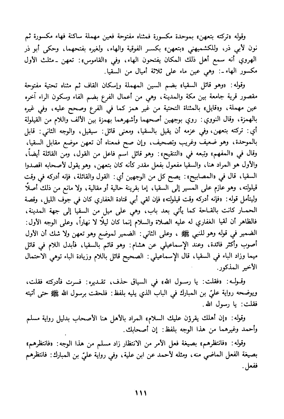 وقوله: "وهو قائل السقيا" بضم السين المهملة وإسكان القاف ثم مثناه تحتية مفتوحة مقصور قرية جامعة بين مكة والمدينة، وهي من أعمال الفرع بضم الفاء وسكون الراء آخره عين مهملة، و"قايل" بالمثناة التحتية من غير همز كما في الفرع وصحح عليه، وفي غيره بالهمزة، وقال النووي: روي بوجهين أصحهما وأشهرهما بهمزة بين الألف واللام من القيلولة أي: تركته بتعهن، وفي عزمه أن يقيل بالسقيا، ومعنى قائل: سيقيل، والوجه الثاني: قابل بالموحدة، وهو ضعيف وغريب وتصحيف، وإن صح فمعناه أن تعهن موضع مقابل السقيا، وقال في "المفهم" وتبعه في "التنقيح": وهو قائل اسم فاعل من القول، ومن القائلة أيضًا، والأول هو المراد هنا، والسقيا مفعول بفعل مقدر كأنه كان بتعهن، وهو يقول لأصحابه اقصدوا السقيا، قال في "المصابيح": يصح كل من الوجهين أي: القول والقائلة، فإنه أدركه في وقت قيلولته، وهو عازم على المسير إلى السقيا، إما بقرينة حالية أو مقالية، ولا مانع من ذلك أصلًا وليتأمل قوله: "فإنه أدركه وقت قيلولته" فإن لقي أبي قتادة الغفاري كان في جوف الليل، وقصة الحمار كانت بالقاحة كما يأتي بعد باب، وهي على ميل من السقيا إلى جهة المدينة، فالظاهر أن لقيا الغفاري له عليه الصلاة والسلام إنما كان ليلًا لا نهارًا، وعلى الوجه الأول: الضمير في قوله وهو للنبي -صلى الله عليه وسلم-، وعلى الثاني: الضمير لموضع وهو تعهن ولا شك أن الأول أصوب وأكثر فائدة، وعند الإسماعيلي عن هشام: وهو قائم بالسقيا، فأبدل اللام في قائل ميما وزاد الباء في السقيا، قال الإسماعيلي: الصحيح قائل باللام وزيادة الباء توهي الاحتمال الأخير المذكور.