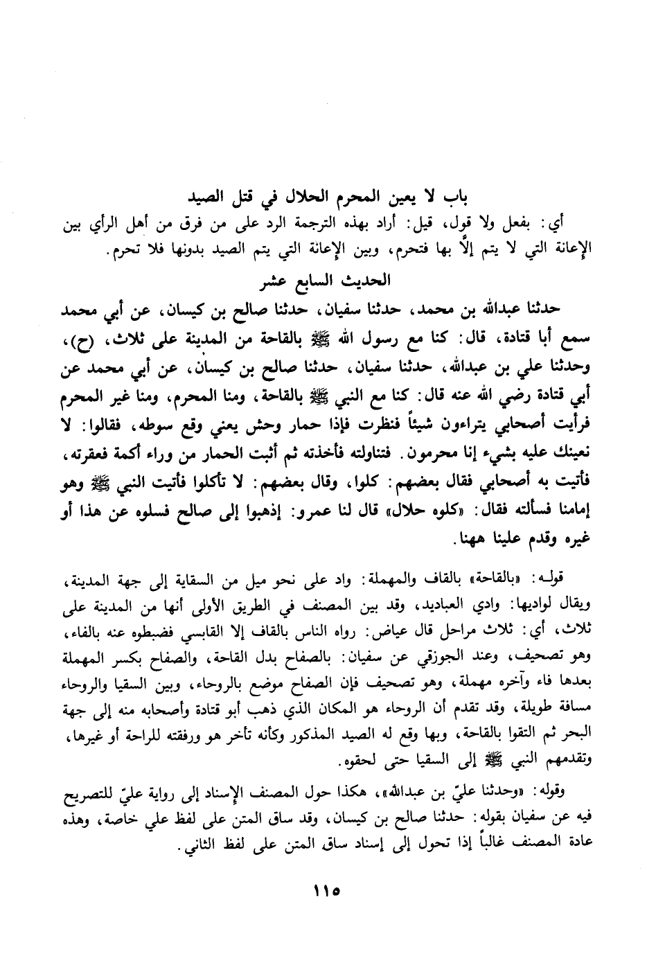 حَدَّثَنَا عَبْدُ اللَّهِ بْنُ مُحَمَّدٍ، حَدَّثَنَا سُفْيَانُ، حَدَّثَنَا صَالِحُ بْنُ كَيْسَانَ، عَنْ أَبِي مُحَمَّدٍ سَمِعَ أَبَا قَتَادَةَ رضي الله عنه قَالَ: كُنَّا مَعَ النَّبِيِّ -صلى الله عليه وسلم- بِالْقَاحَةِ مِنَ الْمَدِينَةِ عَلَى ثَلاَثٍ (ح)، وَحَدَّثَنَا عَلِيُّ بْنُ عَبْدِ اللَّهِ، حَدَّثَنَا سُفْيَانُ، حَدَّثَنَا صَالِحُ بْنُ كَيْسَانَ، عَنْ أَبِي مُحَمَّدٍ عَنْ أَبِي قَتَادَةَ رضي الله عنه قَالَ: كُنَّا مَعَ النَّبِيِّ -صلى الله عليه وسلم- بِالْقَاحَةِ، وَمِنَّا الْمُحْرِمُ، وَمِنَّا غَيْرُ الْمُحْرِمِ، فَرَأَيْتُ أَصْحَابِي يَتَرَاءَوْنَ شَيْئًا فَنَظَرْتُ، فَإِذَا حِمَارُ وَحْشٍ يَعْنِى وَقَعَ سَوْطُهُ فَقَالُوا: لاَ نُعِينُكَ عَلَيْهِ بِشَيْءٍ، إِنَّا مُحْرِمُونَ. فَتَنَاوَلْتُهُ فَأَخَذْتُهُ، ثُمَّ أَتَيْتُ الْحِمَارَ مِنْ وَرَاءِ أَكَمَةٍ، فَعَقَرْتُهُ، فَأَتَيْتُ بِهِ أَصْحَابِي، فَقَالَ بَعْضُهُمْ: كُلُوا. وَقَالَ بَعْضُهُمْ: لاَ تَأْكُلُوا. فَأَتَيْتُ النَّبِيَّ -صلى الله عليه وسلم- وَهُوَ أَمَامَنَا، فَسَأَلْتُهُ فَقَالَ: "كُلُوهُ حَلاَلٌ". قَالَ لَنَا عَمْرٌو: اذْهَبُوا إِلَى صَالِحٍ فَسَلُوهُ عَنْ هَذَا وَغَيْرِهِ، وَقَدِمَ عَلَيْنَا هَاهُنَا.