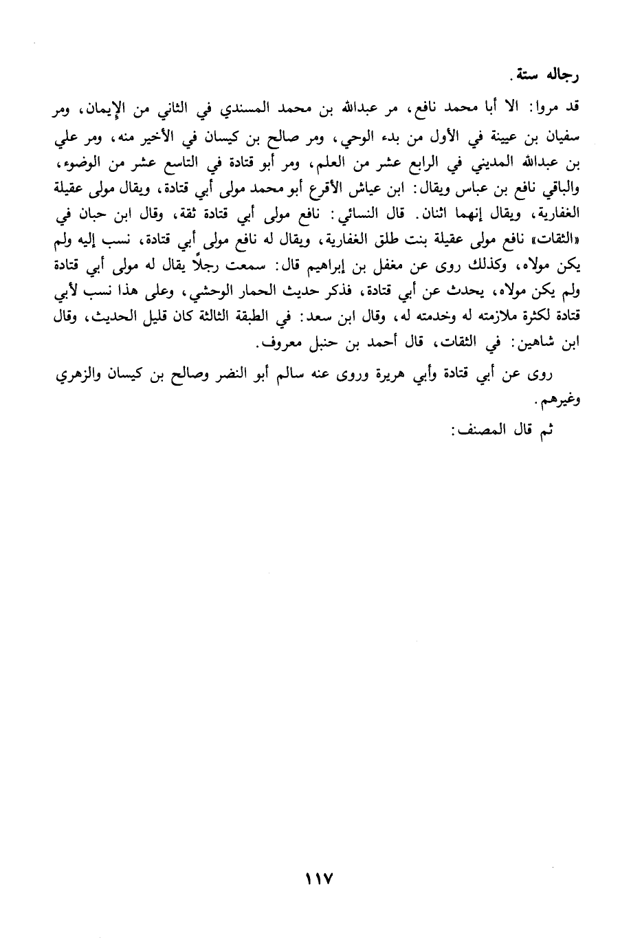قد مرّوا: إلا أبا محمد نافع، مرَّ عبد الله بن محمد المسندي في الثاني من الإيمان، ومرَّ سفيان بن عيينة في الأول من بدء الوحي، ومرَّ صالح بن كيسان في الأخير منه، ومرَّ علي بن عبد الله المديني في الرابع عشر من العلم، ومرَّ أبو قتادة في التاسع عشر من الوضع، والباقي نافع بن عباس ويقال: ابن عياش الأقرع أبو محمد مولى أبي قتادة، ويقال مولى عقيلة الغفارية، ويقال إنهما اثنان. قال النسائي: نافع مولى أبي قتادة ثقة، وقال ابن حبان في "الثقات" نافع مولى عقيلة بنت طلق الغفارية، ويقال له نافع مولى أبي قتادة، نسب إليه ولم يكن مولاه، وكذلك روى عن مغفل بن إبراهيم قال: سمعت رجلًا يقال له مولى أبي قتادة ولم يكن مولاه، يحدث عن أبي قتادة، فذكر حديث الحمار الوحشي، وعلى هذا نسب لأبي قتادة لكثرة ملازمته له وخدمته له، وقال ابن سعد: في الطبقة الثالثة كان قليل الحديث، وقال ابن شاهين: في الثقات، قال أحمد بن حنبل معروف.