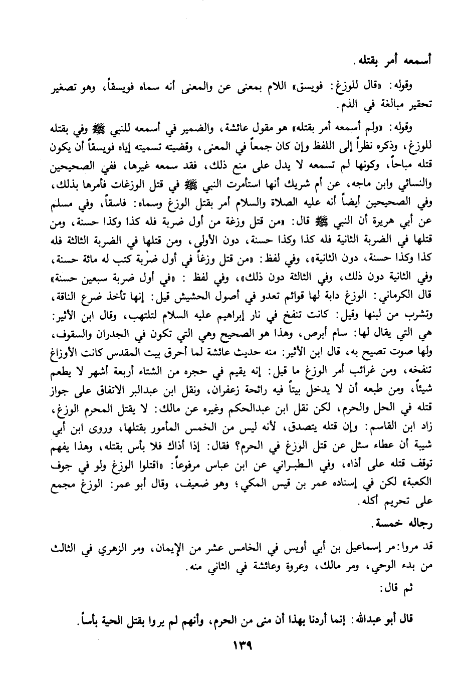 وقوله: "ولم أسمعه أمر بقتله" هو مقول عائشة، والضمير في أسمعه للنبي -صلى الله عليه وسلم- وفي بقتله للوزغ، وذكره نظرًا إلى اللفظ وإن كان جمعًا في المعنى، وقضيته تسميته إياه فويسقًا أن يكون قتله مباحًا، وكونها لم تسمعه لا يدل على منع ذلك، فقد سمعه غيرها، ففي الصحيحين والنسائي وابن ماجه، عن أم شريك أنها استأمرت النبي -صلى الله عليه وسلم- في قتل الوزغات فأمرها بذلك، وفي الصحيحين أيضًا أنه عليه الصلاة والسلام أمر بقتل الوزغ وسماه: فاسقًا، وفي مسلم عن أبي هريرة أن النبي -صلى الله عليه وسلم- قال: "من قتل وزغة من أول ضربة فله كذا وكذا حسنة، ومن قتلها في الضربة الثانية فله كذا وكذا حسنة، دون الأولى، ومن قتلها في الضربة الثالثة فله كذا وكذا حسنة، دون الثانية"، وفي لفظ: "من قتل وزغًا في أول ضربة كتب له مائة حسنة، وفي الثانية دون ذلك، وفي الثالثة دون ذلك"، وفي لفظ: "في أول ضربة سبعين حسنة" قال الكرماني: الوزغ دابة لها قوائم تعدو في أصول الحشيش قيل: إنها تأخذ ضرع الناقة، وتشرب من لبنها وقيل: كانت تنفخ في نار إبراهيم عليه السلام لتلتهب، وقال ابن الأثير: هي التي يقال لها: سام أبرص، وهذا هو الصحيح وهي التي تكون في الجدران والسقوف، ولها صوت تصيح به، قال ابن الأثير: منه حديث عائشة لما أحرق بيت المقدس كانت الأوزاغ تنفخه، ومن غرائب أمر الوزغ ما قيل: إنه يقيم في حجره من الشتاء أربعة أشهر لا يطعم شيئًا، ومن طبعه أن لا يدخل بيتًا فيه رائحة زعفران، ونقل ابن عبد البر الاتفاق على جواز قتله في الحل والحرم، لكن نقل ابن عبد الحكم وغيره عن مالك: لا يقتل المحرم الوزغ، زاد ابن القاسم: وإن قتله يتصدق؛ لأنه ليس من الخمس المأمور بقتلها، وروى ابن أبي شيبة أن عطاء سئل عن قتل الوزغ في الحرم؟ فقال: إذا أذاك فلا بأس بقتله، وهذا يفهم توقف قتله على أذاه، وفي الطبراني عن ابن عباس مرفوعًا: "اقتلوا الوزغ ولو في جوف الكعبة" لكن في إسناده عمر بن قيس المكي؛ وهو ضعيف، وقال أبو عمر: الوزغ مجمع على تحريم أكله.