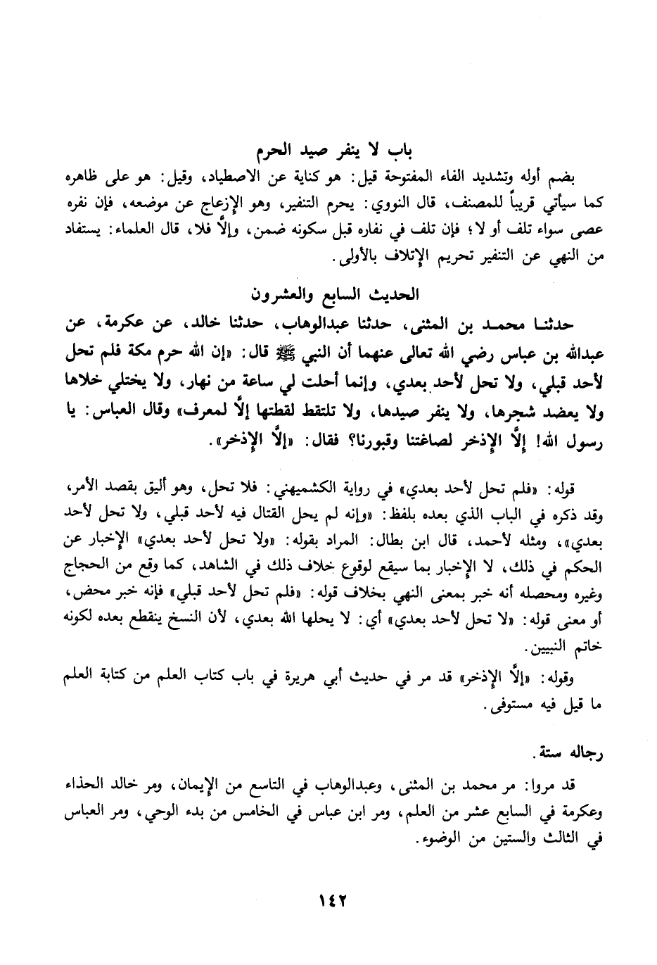 حَدَّثَنَا مُحَمَّدُ بْنُ الْمُثَنَّى، حَدَّثَنَا عَبْدُ الْوَهَّابِ، حَدَّثَنَا خَالِدٌ، عَنْ عِكْرِمَةَ، عَنِ ابْنِ عَبَّاسٍ رضي الله عنهما أَنَّ النَّبِيَّ -صلى الله عليه وسلم- قَالَ: "إِنَّ اللَّهَ حَرَّمَ مَكَّةَ، فَلَمْ تَحِلَّ لأَحَدٍ قَبْلِي، وَلاَ تَحِلُّ لأَحَدٍ بَعْدِي، وَإِنَّمَا أُحِلَّتْ لِي سَاعَةً مِنْ نَهَارٍ، لاَ يُخْتَلَي خَلاَهَا، وَلاَ يُعْضَدُ شَجَرُهَا، وَلاَ يُنَفَّرُ صَيْدُهَا، وَلاَ تُلْتَقَطُ لُقَطَتُهَا إِلاَّ لِمُعَرِّفٍ". وَقَالَ الْعَبَّاسُ: يَا رَسُولَ اللَّهِ. إِلاَّ الإِذْخِرَ لِصَاغَتِنَا وَقُبُورِنَا؟ فَقَالَ: "إِلاَّ الإِذْخِرَ".