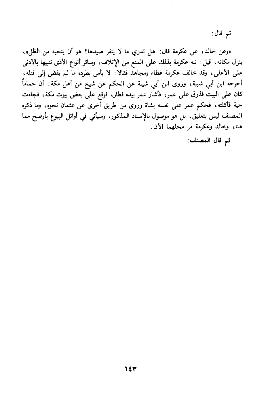 "وعن خالد، عن عكرمة قال: هل تدري ما لا ينفر صيدها؟ هو أن ينحيه من الظل"، ينزل مكانه، قيل: نبه عكرمة بذلك على المنع من الإتلاف، وسائر أنواع الأذى تنبيها بالأدنى على الأعلى، وقد خالف عكرمة عطاء ومجاهد فقالا: لا بأس بطرده ما لم يفض إلى قتله، أخرجه ابن أبي شيبة، وروى ابن أبي شيبة عن الحكم عن شيخ من أهل مكة: أن حمامًا كان على البيت فذرق على عمر، فأشار عمر بيده فطار، فوقع على بعض بيوت مكة، فجاءت حية فأكلته، فحكم عمر على نفسه بشاة وروى من طريق أخرى عن عثمان نحوه، وما ذكره المصنف ليس بتعليق، بل هو موصول بالإسناد المذكور، وسيأتي في أوائل البيوع بأوضح مما هنا، وخالد وعكرمة مرَّ محلهما الآن.