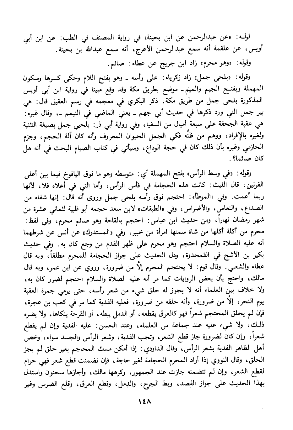 وقوله: "بلحى جمل" زاد زكرياء: على رأسه -وهو بفتح اللام وحكى كسرها وسكون المهملة وبفتح الجيم والميم- موضع بطريق مكة وقد وقع مبينا في رواية ابن أبي أويس المذكورة بلحى جمل من طريق مكة، ذكر البكري في معجمه في رسم العقيق قال: هي بير جمل التي ورد ذكرها في حديث أبي جهم -يعني الماضي في التيمم-، وقال غيره: هي عقبة الجحفة على سبعة أميال من السقيا، وفي رواية أبي ذر: بلحمي جمل بصيغة التثنية ولغيره بالإفراد، ووهم من ظنِّه فكي الجمل الحيوان المعروف وأنه كان آلة الحجم، وجزم الحازمي وغيره بأن ذلك كان في حجة الوداع، وسيأتي في كتاب الصيام البحث في أنه هل كان صائما؟.