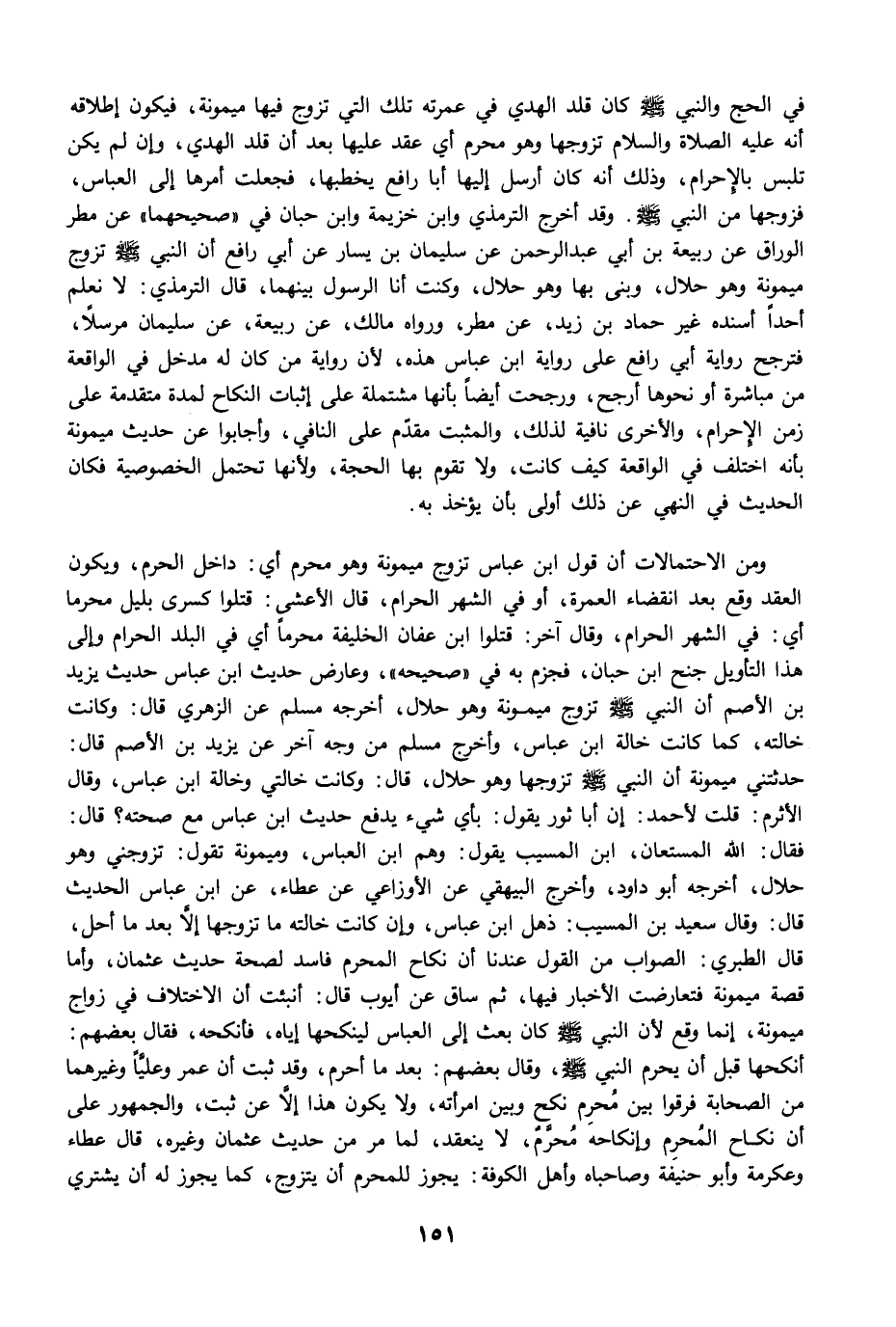 في الحج والنبي -صلى الله عليه وسلم- كان قلد الهدي في عمرته تلك التي تزوج فيها ميمونة، فيكون إطلاقه أنه عليه الصلاة والسلام تزوجها وهو محرم أي عقد عليها بعد أن قلد الهدي، وإن لم يكن تلبس بالإحرام، وذلك أنه كان أرسل إليها أبا رافع يخطبها، فجعلت أمرها إلى العباس، فزوجها من النبي -صلى الله عليه وسلم-. وقد أخرج الترمذي وابن خزيمة وابن حبان في "صحيحهما" عن مطر الوراق عن ربيعة بن أبي عبد الرحمن عن سليمان بن يسار عن أبي رافع أن النبي -صلى الله عليه وسلم- تزوج ميمونة وهو حلال، وبنى بها وهو حلال، وكنت أنا الرسول بينهما، قال الترمذي: لا نعلم أحدًا أسنده غير حماد بن زيد، عن مطر، ورواه مالك، عن ربيعة، عن سليمان مرسلًا، فترجح رواية أبي رافع على رواية ابن عباس هذه؛ لأن رواية من كان له مدخل في الواقعة من مباشرة أو نحوها أرجح، ورجحت أيضًا بأنها مشتملة على إثبات النكاح لمدة متقدمة على زمن الإحرام، والأخرى نافية لذلك، والمثبت مقدّم على النافي، وأجابوا عن حديث ميمونة بأنه اختلف في الواقعة كيف كانت، ولا تقوم بها الحجة، ولأنها تحتمل الخصوصية فكان الحديث في النهي عن ذلك أولى بأن يؤخذ به.