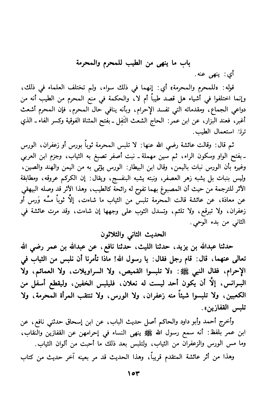 ثم قال: وقالت عائشة رضي الله عنها: لا تلبس المحرمة ثوبًا بورس أو زعفران، الورس -بفتح الواو وسكون الراء، ثم سين مهملة- نبت أصفر تصبغ به الثياب، وجزم ابن العربي وغيره بأن الورس نبات باليمن، وقال ابن البيطار: الورس يؤتى به من اليمن والهند والصين، وليس بنبات بل يشبه زهر العصفر، ونبته يشبه البنفسج، ويقال: إن الكركم عروقه، ومطابقة الأثر للترجمة من حيث أن المصبوغ بهما تفوح له رائحة كالطيب، وهذا الأثر قد وصله البيهقي عن معاذة، عن عائشة قالت المحرمة تلبس من الثياب ما شاءت، إلاَّ ثوبًا مسَّه وَرس أو زعفران، ولا تبرقع، ولا تلثم، وتسدل الثوب على وجهها إن شاءت، وقد مرت عائشة في الثاني من بدء الوحي.