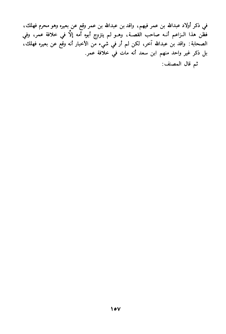 في ذكر أولاد عبد الله بن عمر فيهم، واقد بن عبد الله بن عمر وقع عن بعيره وهو محرم فهلك، فظن هذا الزاعم أنه صاحب القصة، وهو لم يتزوج أبوه أمه إلاَّ في خلافة عمر، وفي الصحابة: واقد بن عبد الله آخر، لكن لم أر في شيء من الأخبار أنه وقع عن بعيره فهلك، بل ذكر غير واحد منهم ابن سعد أنه مات في خلافة عمر.