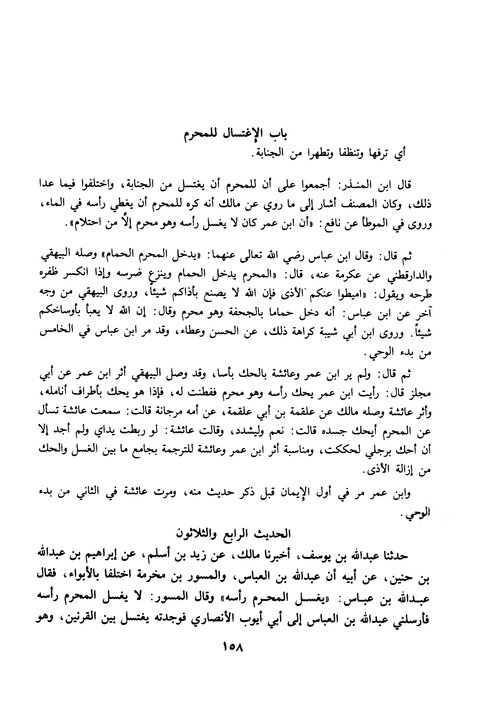 ثم قال: ولم ير ابن عمر وعائشة بالحك بأسا، وقد وصل البيهقي أثر ابن عمر عن أبي مجلز قال: رأيت ابن عمر يحك رأسه وهو محرم ففطنت له، فإذا هو يحك بأطراف أنامله، وأثر عائشة وصله مالك عن علقمة بن أبي علقمة، عن أمه مرجانة قالت: سمعت عائشة تسأل عن المحرم أيحك جسده قالت: نعم وليشدد، وقالت عائشة: لو ربطت يداي ولم أجد إلا أن أحك برجلي لحككت، ومناسبة أثر ابن عمر وعائشة للترجمة بجامع ما بين الغسل والحك من إزالة الأذى.
