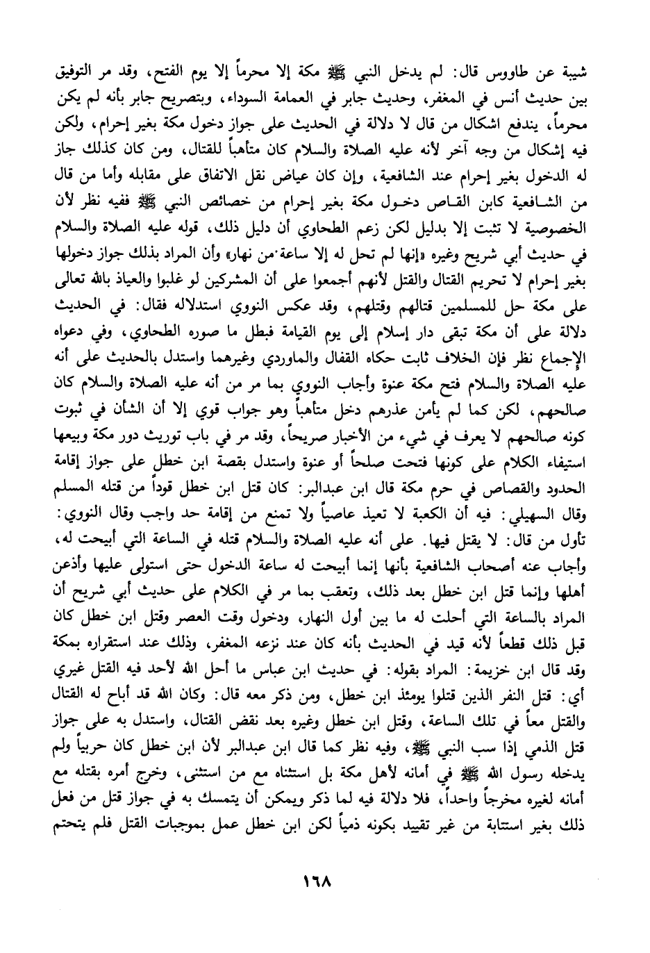 شيبة عن طاووس قال: لم يدخل النبي -صلى الله عليه وسلم- مكة إلا محرمًا إلا يوم الفتح، وقد مرَّ التوفيق بين حديث أنس في المغفر، وحديث جابر في العمامة السوداء، وبتصريح جابر بأنه لم يكن محرمًا، يندفع إشكال من قال لا دلالة في الحديث على جواز دخول مكة بغير إحرام، ولكن فيه إشكال من وجه آخر لأنه عليه الصلاة والسلام كان متأهبًا للقتال، ومن كان كذلك جاز له الدخول بغير إحرام عند الشافعية، وإن كان عياض نقل الاتفاق على مقابله وأما من قال من الشافعية كابن القاص دخول مكة بغير إحرام من خصائص النبي -صلى الله عليه وسلم- ففيه نظر لأن الخصوصية لا تثبت إلا بدليل لكن زعم الطحاوي أن دليل ذلك، قوله عليه الصلاة والسلام في حديث أبي شريح وغيره "إنها لم تحل له إلا ساعة من نهار" وأن المراد بذلك جواز دخولها بغير إحرام لا تحريم القتال والقتل لأنهم أجمعوا على أن المشركين لو غلبوا والعياذ بالله تعالى على مكة حل للمسلمين قتالهم وقتلهم، وقد عكس النووي استدلاله فقال: في الحديث دلالة على أن مكة تبقى دار إسلام إلى يوم القيامة فبطل ما صوره الطحاوي، وفي دعواه الإجماع نظر فإن الخلاف ثابت حكاه القفال والماوردي وغيرهما واستدل بالحديث على أنه عليه الصلاة والسلام فتح مكة عنوة وأجاب النووي بما مرَّ من أنه عليه الصلاة والسلام كان صالحهم، لكن كما لم يأمن عذرهم دخل متأهبًا وهو جواب قوي إلا أن الشأن في ثبوت كونه صالحهم لا يعرف في شيء من الأخبار صريحًا، وقد مرَّ في باب توريث دور مكة وبيعها استيفاء الكلام على كونها فتحت صلحًا أو عنوة واستدل بقصة ابن خطل على جواز إقامة الحدود والقصاص في حرم مكة قال ابن عبد البر: كان قتل ابن خطل قودًا من قتله المسلم وقال السهيلي: فيه أن الكعبة لا تعيذ عاصيًا ولا تمنع من إقامة حد واجب وقال النووي: تأول من قال: لا يقتل فيها. على أنه عليه الصلاة والسلام قتله في الساعة التي أبيحت له، وأجاب عنه أصحاب الشافعية بأنها إنما أبيحت له ساعة الدخول حتى استولى عليها وأذعن أهلها وإنما قتل ابن خطل بعد ذلك، وتعقب بما مرَّ في الكلام على حديث أبي شريح أن المراد بالساعة التي أحلت له ما بين أول النهار، ودخول وقت العصر وقتل ابن خطل كان قبل ذلك قطعًا لأنه قيد في الحديث بأنه كان عند نزعه المغفر، وذلك عند استقراره بمكة وقد قال ابن خزيمة: المراد بقوله: في حديث ابن عباس ما أحل الله لأحد فيه القتل غيري أي: قتل النفر الذين قتلوا يومئذ ابن خطل، ومن ذكر معه قال: وكان الله قد أباح له القتال والقتل معًا في تلك الساعة، وقتل ابن خطل وغيره بعد نقض القتال، واستدل به على جواز قتل الذمي إذا سب النبي -صلى الله عليه وسلم-، وفيه نظر كما قال ابن عبد البر لأن ابن خطل كان حربيًا ولم يدخله رسول الله -صلى الله عليه وسلم- في أمانه لأهل مكة بل استثناه مع من استثنى، وخرج أمره بقتله مع أمانه لغيره مخرجًا واحدًا، فلا دلالة فيه لما ذكر ويمكن أن يتمسك به في جواز قتل من فعل ذلك بغير استتابة من غير تقييد بكونه ذميًا لكن ابن خطل عمل بموجبات القتل فلم يتحتم