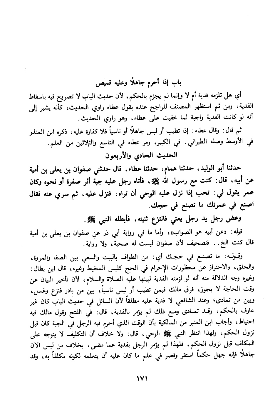 حَدَّثَنَا أَبُو الْوَلِيدِ، حَدَّثَنَا هَمَّامٌ، حَدَّثَنَا عَطَاءٌ، قَالَ حَدَّثَنِي صَفْوَانُ بْنُ يَعْلَى بن أمية عَنْ أَبِيهِ، قَالَ: كُنْتُ مَعَ رَسُولِ اللَّهِ -صلى الله عليه وسلم- فَأَتَاهُ رَجُلٌ عَلَيْهِ جُبَّةٌ فِيهِ أَثَرُ صُفْرَةٍ أَوْ نَحْوُهُ، وَكَانَ عُمَرُ يَقُولُ لِي: تُحِبُّ إِذَا نَزَلَ عَلَيْهِ الْوَحْي أَنْ تَرَاهُ، فَنَزَلَ عَلَيْهِ، ثُمَّ سُرِّيَ عَنْهُ فَقَالَ اصْنَعْ فِي عُمْرَتِكَ مَا تَصْنَعُ فِي حَجِّكَ.