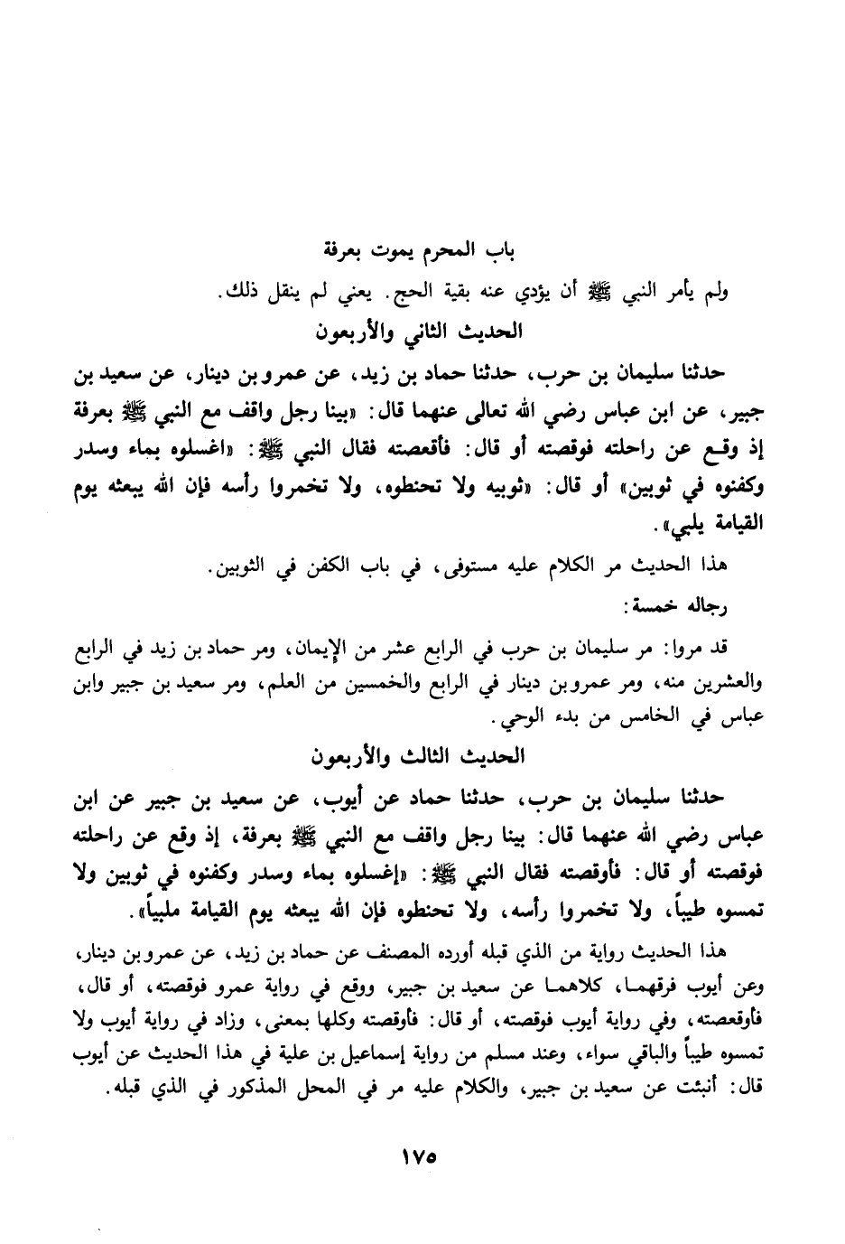 حَدَّثَنَا سُلَيْمَانُ بْنُ حَرْبٍ، حَدَّثَنَا حَمَّادُ بْنُ زَيْدٍ، عَنْ عَمْرِو بْنِ دِينَارٍ، عَنْ سَعِيدِ بْنِ جُبَيْرٍ، عَنِ ابْنِ عَبَّاسٍ رضي الله عنهما قَالَ: "بَيْنَا رَجُلٌ وَاقِفٌ مَعَ النَّبِيِّ -صلى الله عليه وسلم- بِعَرَفَةَ إِذْ وَقَعَ عَنْ رَاحِلَتِهِ، فَوَقَصَتْهُ أَوْ قَالَ: فَأَقْعَصَتْهُ فَقَالَ النَّبِيُّ -صلى الله عليه وسلم-: "اغْسِلُوهُ بِمَاءٍ وَسِدْرٍ، وَكَفِّنُوهُ فِي ثَوْبَيْنِ" أَوْ قَالَ: "ثَوْبَيْهِ وَلاَ تُحَنِّطُوهُ، وَلاَ تُخَمِّرُوا رَأْسَهُ، فَإِنَّ اللَّهَ يَبْعَثُهُ يَوْمَ الْقِيَامَةِ يُلَبِّي".
