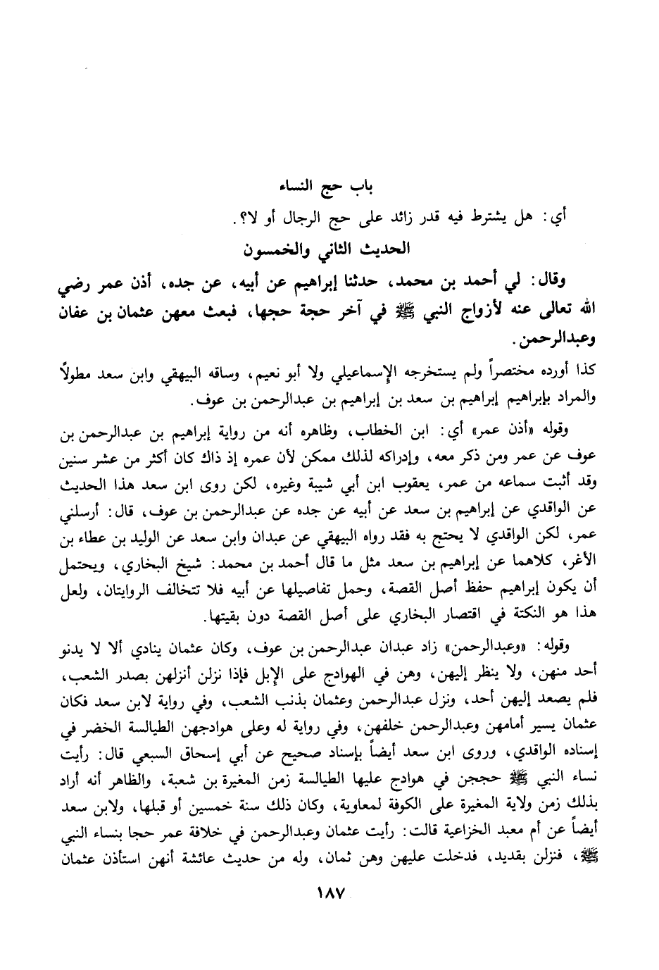 وَقَالَ: لِي أَحْمَدُ بْنُ مُحَمَّدٍ، حَدَّثَنَا إِبْرَاهِيمُ عَنْ أَبِيهِ، عَنْ جَدِّهِ، أَذِنَ عُمَرُ رضي الله عنه لأَزْوَاجِ النَّبِيِّ -صلى الله عليه وسلم- فِي آخِرِ حَجَّةٍ حَجَّهَا، فَبَعَثَ مَعَهُنَّ عُثْمَانَ بْنَ عَفَّانَ وَعَبْدَ الرَّحْمَنِ.