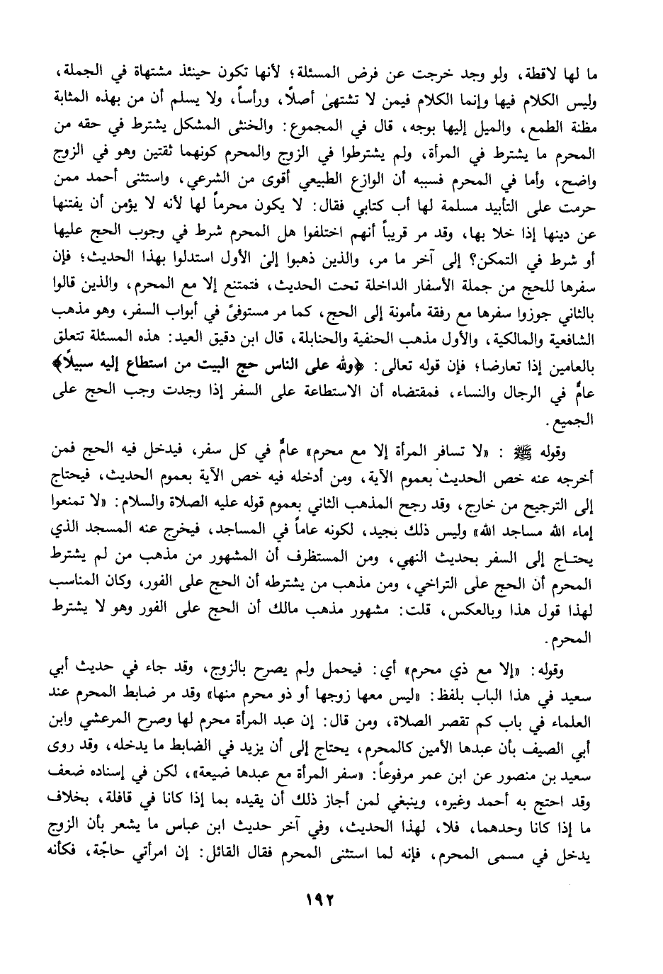 وقوله -صلى الله عليه وسلم-: "لا تسافر المرأة إلا مع محرم" عامٌّ في كل سفر، فيدخل فيه الحج فمن أخرجه عنه خص الحديث بعموم الآية، ومن أدخله فيه خص الآية بعموم الحديث، فيحتاج إلى الترجيح من خارج، وقد رجح المذهب الثاني بعموم قوله عليه الصلاة والسلام: "لا تمنعوا إماء الله مساجد الله" وليس ذلك بجيد، لكونه عامًا في المساجد، فيخرج عنه المسجد الذي يحتاج إلى السفر بحديث النهي، ومن المستظرف أن المشهور من مذهب من لم يشترط المحرم أن الحج على التراخي، ومن مذهب من يشترطه أن الحج على الفور، وكان المناسب لهذا قول هذا وبالعكس، قلت: مشهور مذهب مالك أن الحج على الفور وهو لا يشترط المحرم.