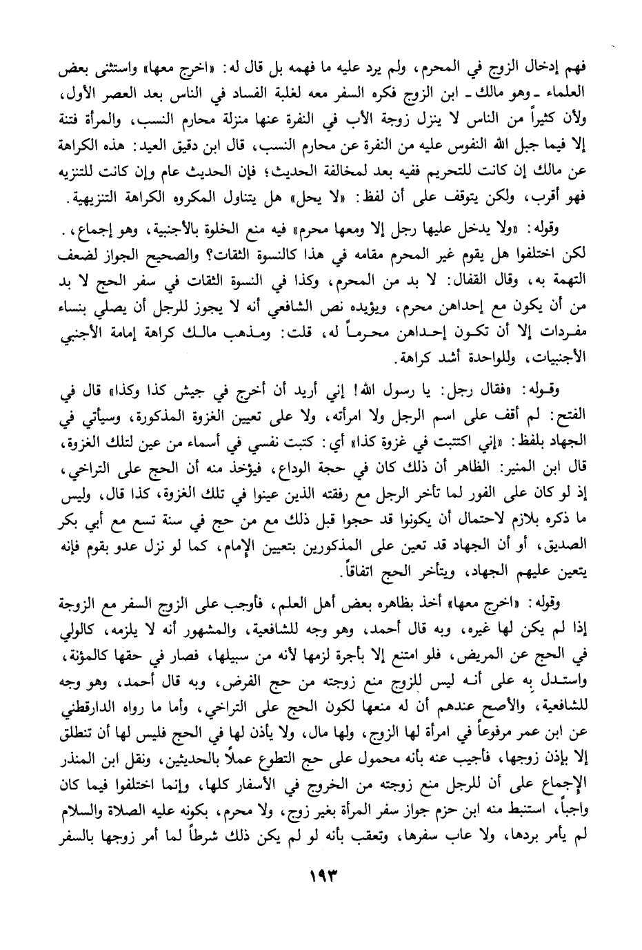 فهم إدخال الزوج في المحرم، ولم يرد عليه ما فهمه بل قال له: "اخرج معها" واستثنى بعض العلماء -وهو مالك- ابن الزوج فكره السفر معه لغلبة الفساد في الناس بعد العصر الأول، ولأن كثيرًا من الناس لا ينزل زوجة الأب في النفرة عنها منزلة محارم النسب، والمرأة فتنة إلا فيما جبل الله النفوس عليه من النفرة عن محارم النسب، قال ابن دقيق العيد: هذه الكراهة عن مالك إن كانت للتحريم ففيه بعد لمخالفة الحديث؛ فإن الحديث عام وإن كانت للتنزيه فهو أقرب، ولكن يتوقف على أن لفظ: "لا يحل" هل يتناول المكروه الكراهة التنزيهية.