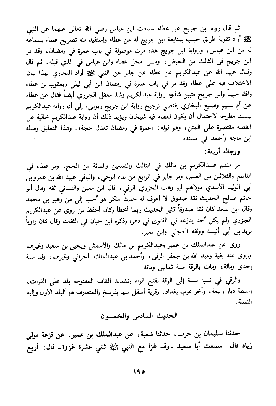 ثم قال رواه ابن جريج عن عطاء سمعت ابن عباس رضي الله تعالى عنهما عن النبي -صلى الله عليه وسلم- أراد تقوية طريق حبيب بمتابعة ابن جريج له عن عطاء واستفيد منه تصريح عطاء بسماعه له من ابن عباس، ورواية ابن جريج هذه مرت موصولة في باب عمرة في رمضان، وقد مرَّ ابن جريج في الثالث من الحيض، ومرَّ محل عطاء وابن عباس في الذي قبله، ثم قال وقال عبيد الله عن عبد الكريم عن عطاء عن جابر عن النبي -صلى الله عليه وسلم- أراد البخاري بهذا بيان الاختلاف فيه على عطاء وقد مرَّ في باب عمرة في رمضان ابن أبي ليلى ويعقوب بن عطاء وافقا حبيبًا وابن جريج فتبين شذوذ رواية عبد الكريم وشذ معقل الجزري أيضًا فقال عن عطاء عن أم سليم وصنيع البخاري يقتضي ترجيح رواية ابن جريج ويومىء إلى أن رواية عبد الكريم ليست مطرحة لاحتمال أن يكون لعطاء فيه شيخان ويؤيد ذلك أن رواية عبد الكريم خالية عن القصة مقتصرة على المتن، وهو قوله: "عمرة في رمضان تعدل حجة"، وهذا التعليق وصله ابن ماجه وأحمد في مسنده.
