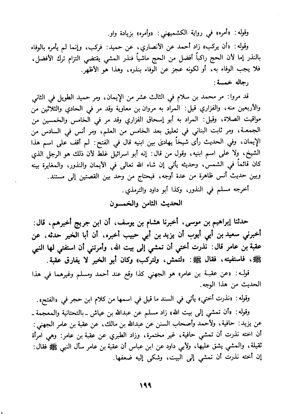 قد مرّوا: مرَّ محمد بن سلام في الثالث عشر من الإيمان، ومرَّ حميد الطويل في الثاني والأربعين منه، والفزاري قيل: المراد به مروان بن معاوية وقد مرَّ في الحادي والثلاثين من مواقيت الصلاة، وقيل: المراد به أبو إسحاق الفزاري وقد مرَّ في الخامس والخمسين من الجمعة، ومرَّ ثابت البناني في تعليق بعد الخامس من العلم، ومرَّ أنس في السادس من الإيمان، وفي الحديث رأى شيخًا يهادى بين ابنيه قال في الفتح: لم أقف على اسم هذا الشيخ، ولا على اسم ابنيه، وقول من قال: إنه أبو إسرائيل غلط لأن ذلك هو الرجل الذي كان قائمًا في الشمس، وحديثه يأتي إن شاء الله تعالى في الأيمان والنذور، والمغايرة بينه وبين حديث أنس ظاهرة من عدة أوجه، فيحتاج من وحد بين القصتين إلى مستند.