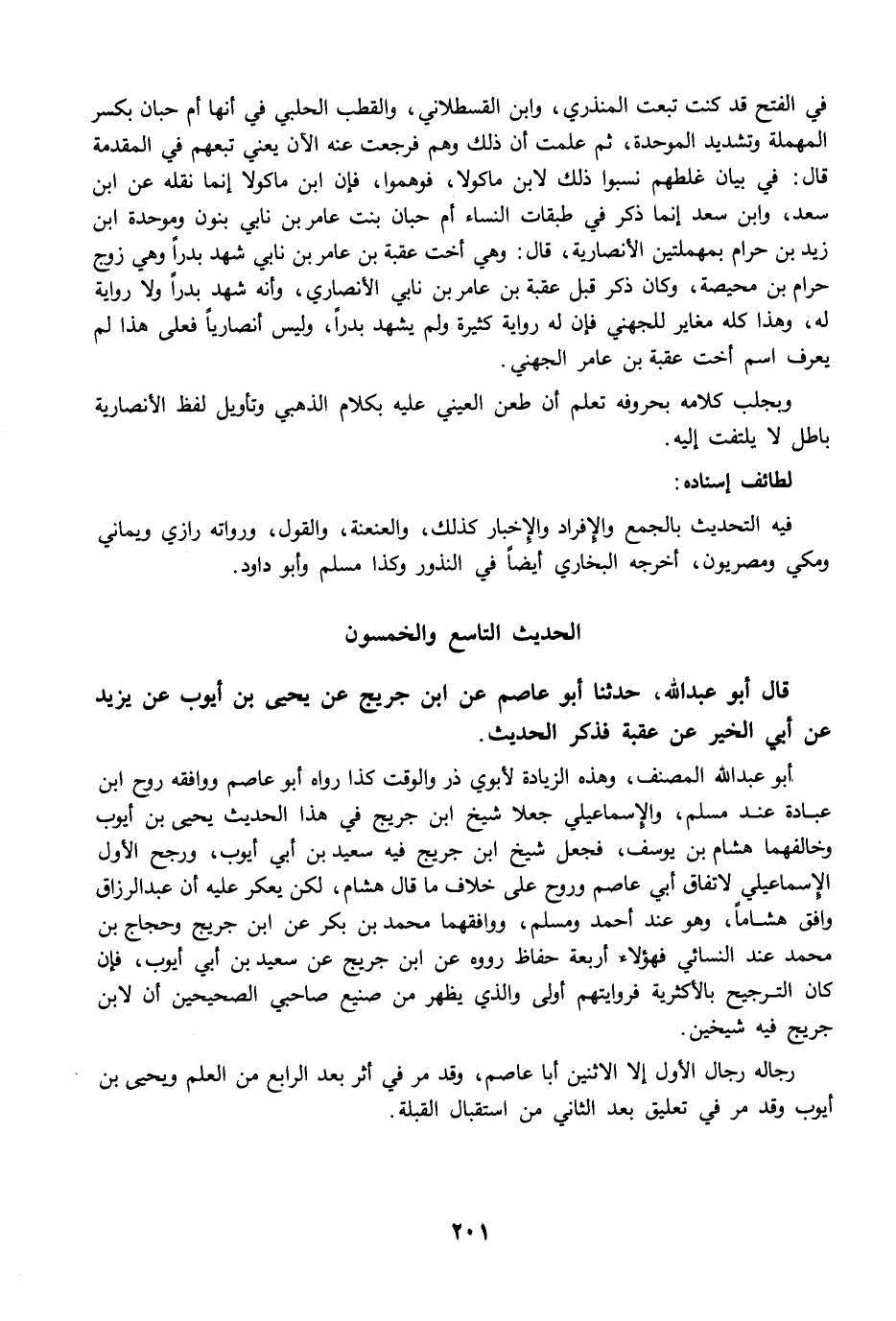 في الفتح قد كنت تبعت المنذري، وابن القسطلاني، والقطب الحلبي في أنها أم حبان بكسر المهملة وتشديد الموحدة، ثم علمت أن ذلك وهم فرجعت عنه الآن يعني تبعهم في المقدمة قال: في بيان غلطهم نسبوا ذلك لابن ماكولا، فوهموا، فإن ابن ماكولا إنما نقله عن ابن سعد، وابن سعد إنما ذكر في طبقات النساء أم حبان بنت عامر بن نابي بنون وموحدة ابن زيد بن حرام بمهملتين الأنصارية، قال: وهي أخت عقبة بن عامر بن نابي شهد بدراً وهي زوج حرام بن محيصة، وكان ذكر قبل عقبة بن عامر بن نابي الأنصاري، وأنه شهد بدرًا ولا رواية له، وهذا كله مغاير للجهني فإن له رواية كثيرة ولم يشهد بدرًا، وليس أنصاريًا فعلى هذا لم يعرف اسم أخت عقبة بن عامر الجهني.