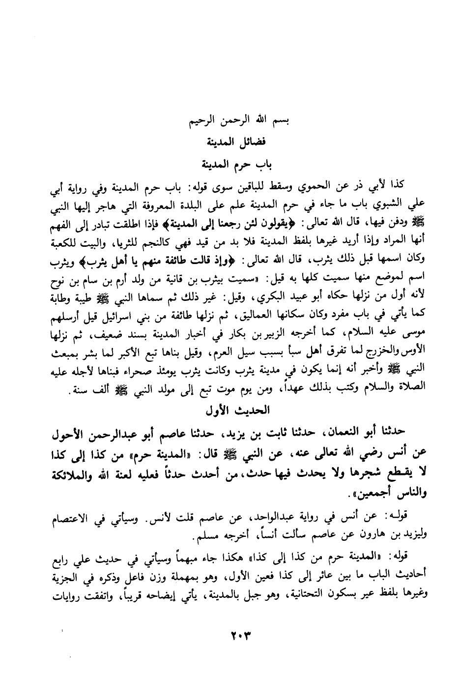 حَدَّثَنَا أَبُو النُّعْمَانِ، حَدَّثَنَا ثَابِتُ بْنُ يَزِيدَ، حَدَّثَنَا عَاصِمٌ أَبُو عَبْدِ الرَّحْمَنِ الأَحْوَلُ عَنْ أَنَسٍ رضي الله عنه، عَنِ النَّبِيِّ -صلى الله عليه وسلم- قَالَ: "الْمَدِينَةُ حَرَمٌ" مِنْ كَذَا إِلَى كَذَا، لاَ يُقْطَعُ شَجَرُهَا، وَلاَ يُحْدَثُ فِيهَا حَدَثٌ، مَنْ أَحْدَثَ حَدَثًا فَعَلَيْهِ لَعْنَةُ اللَّهِ وَالْمَلاَئِكَةِ وَالنَّاسِ أَجْمَعِينَ.