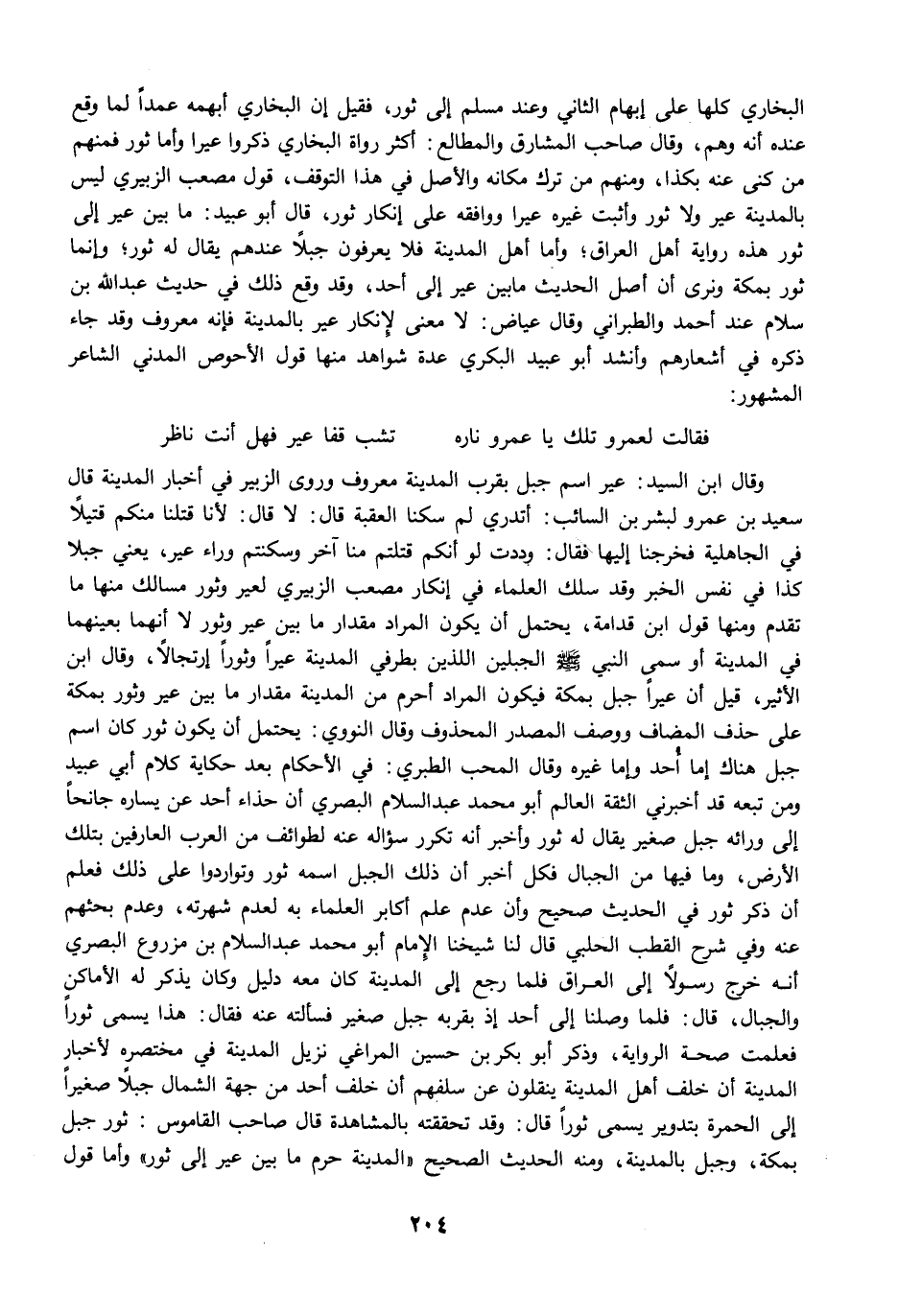 وقال ابن السيد: عير اسم جبل بقرب المدينة معروف وروى الزبير في أخبار المدينة قال سعيد بن عمرو لبشر بن السائب: أتدري لم سكنا العقبة قال: لا قال: لأنا قتلنا منكم قتيلًا في الجاهلية فخرجنا إليها فقال: وددت لو أنكم قتلتم منا آخر وسكنتم وراء عير، يعني جبلا كذا في نفس الخبر وقد سلك العلماء في إنكار مصعب الزبيري لعير وثور مسالك منها ما تقدم ومنها قول ابن قدامة، يحتمل أن يكون المراد مقدار ما بين عير وثور لا أنهما بعينهما في المدينة أو سمى النبي -صلى الله عليه وسلم- الجبلين اللذين بطرفي المدينة عيرًا وثورًا إرتجالًا، وقال ابن الأثير، قيل أن عيرًا جبل بمكة فيكون المراد أحرم من المدينة مقدار ما بين عير وثور بمكة على حذف المضاف ووصف المصدر المحذوف وقال النووي: يحتمل أن يكون ثور كان اسم جبل هناك إما أُحد وإما غيره وقال المحب الطبري: في الأحكام بعد حكاية كلام أبي عبيد ومن تبعه قد أخبرني الثقة العالم أبو محمد عبد السلام البصري أن حذاء أحد عن يساره جانحًا إلى ورائه جبل صغير يقال له ثور وأخبر أنه تكرر سؤاله عنه لطوائف من العرب العارفين بتلك الأرض، وما فيها من الجبال فكل أخبر أن ذلك الجبل اسمه ثور وتواردوا على ذلك فعلم أن ذكر ثور في الحديث صحيح وأن عدم علم أكابر العلماء به لعدم شهرته، وعدم بحثهم عنه وفي شرح القطب الحلبي قال لنا شيخنا الإمام أبو محمد عبد السلام بن مزروع البصري أنه خرج رسولًا إلى العراق فلما رجع إلى المدينة كان معه دليل وكان يذكر له الأماكن والجبال، قال: فلما وصلنا إلى أحد إذ بقربه جبل صغير فسألته عنه فقال: هذا يسمى ثورًا فعلمت صحة الرواية، وذكر أبو بكر بن حسين المراغي نزيل المدينة في مختصره لأخبار المدينة أن خلف أهل المدينة ينقلون عن سلفهم أن خلف أحد من جهة الشمال جبلًا صغيرًا إلى العمرة بتدوير يسمى ثورًا قال: وقد تحققته بالمشاهدة قال صاحب القاموس: ثور جبل بمكة، وجبل بالمدينة، ومنه الحديث الصحيح "المدينة حرم ما بين عير إلى ثور" وأما قول
