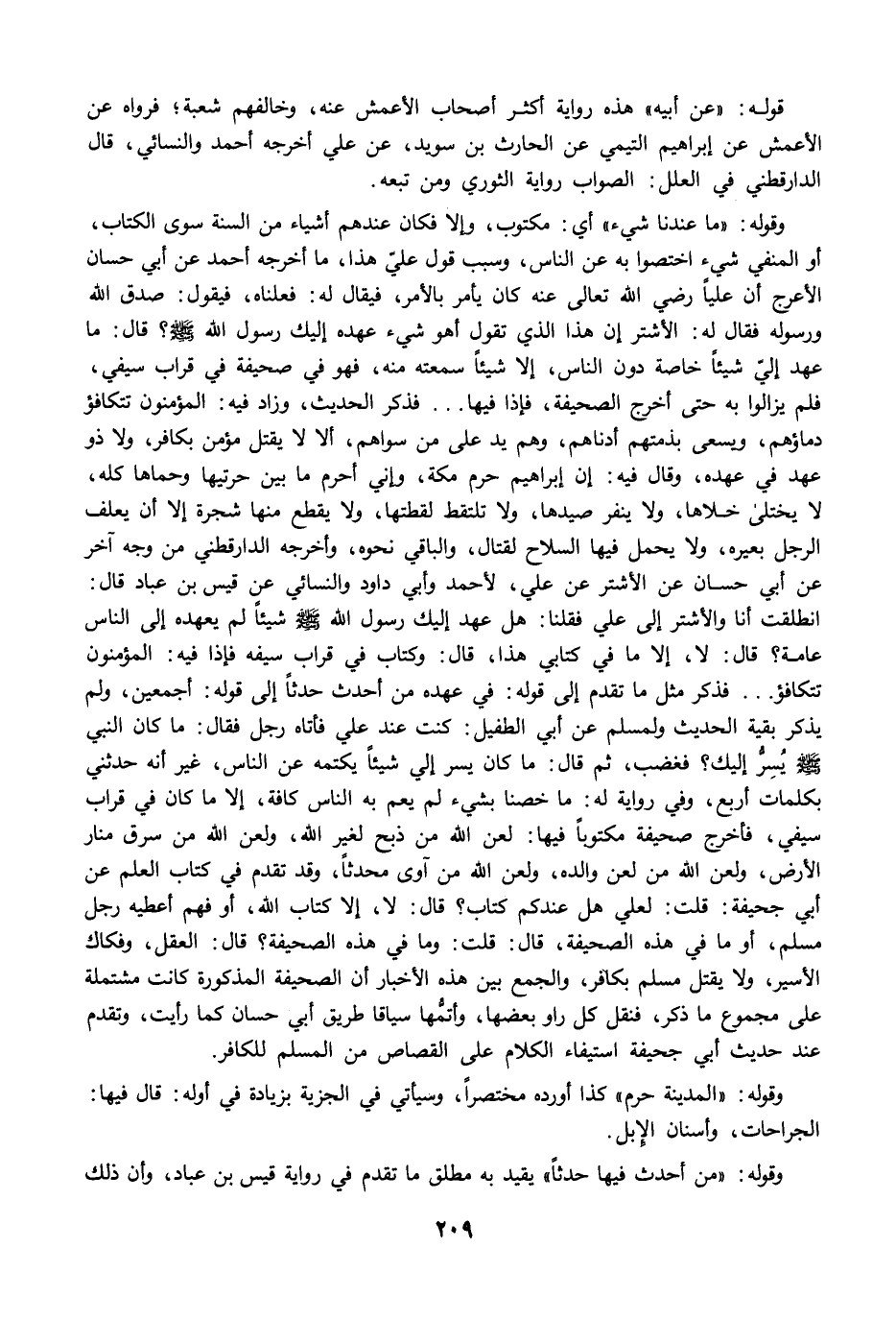 وقوله: "ما عندنا شيء" أي: مكتوب، وإلا فكان عندهم أشياء من السنة سوى الكتاب، أو المنفي شيء اختصوا به عن الناس، وسبب قول عليّ هذا، ما أخرجه أحمد عن أبي حسان الأعرج أن عليًا رضي الله تعالى عنه كان يأمر بالأمر، فيقال له: فعلناه، فيقول: صدق الله ورسوله فقال له: الأشتر إن هذا الذي تقول أهو شيء عهده إليك رسول الله -صلى الله عليه وسلم-؟ قال: ما عهد إليّ شيئًا خاصة دون الناس، إلا شيئًا سمعته منه، فهو في صحيفة في قراب سيفي، فلم يزالوا به حتى أخرج الصحيفة، فإذا فيها ... فذكر الحديث، وزاد فيه: المؤمنون تتكافؤ دماؤهم، ويسعى بذمتهم أدناهم، وهم يد على من سواهم، ألا لا يقتل مؤمن بكافر، ولا ذو عهد في عهده، وقال فيه: إن إبراهيم حرم مكة، وإني أحرم ما بين حرتيها وسماها كله، لا يختلى خلاها ولا ينفر صيدها، ولا تلتقط لقطتها، ولا يقطع منها شجرة إلا أن يعلف الرجل بعيره، ولا يحمل فيها السلاح لقتال، والباقي نحوه، وأخرجه الدارقطني من وجه آخر عن أبي حسان عن الأشتر عن علي، لأحمد وأبي داود والنسائي عن قيس بن عاد قال: انطلقت أنا والأشتر إلى علي فقلنا: هل عهد إليك رسول الله -صلى الله عليه وسلم- شيئًا لم يعهده إلى الناس عامة؟ قال: لا، إلا ما في كتابي هذا، قال: وكتاب في قراب سيفه فإذا فيه: المؤمنون تتكافؤ ... فذكر مثل ما تقدم إلى قوله: في عهده من أحدث حديثًا إلى قوله: أجمعين، ولم يذكر بقية الحديث ولمسلم عن أبي الطفيل: كنت عند علي فأتاه رجل فقال: ما كان النبي -صلى الله عليه وسلم- يُسِرُّ إليك؟ فغضب، ثم قال: ما كان يسر إلى شيئًا يكتمه عن الناس، غير أنه حدثني بكلمات أربع، وفي رواية له: ما خصنا بشيء لم يعم به الناس كافة، إلا ما كان في قراب سيفي، فأخرج صحيفة مكتوبًا فيها: لعن الله من ذبح لغير الله، ولعن الله من سرق منار الأرض، ولعن الله من لعن والده، ولعن الله من آوى محدثًا، وقد تقدم في كتاب العلم عن أبي جحيفة: قلت: لعلي هل عندكم كتاب؟ قال: لا، إلا كتاب الله، أو فهم أعطيه رجل مسلم، أو ما في هذه الصحيفة، قال: قلت: وما في هذه الصحيفة؟ قال: العقل، وفكاك الأسير، ولا يقتل مسلم بكافر، والجمع بين هذه الأخبار أن الصحيفة المذكورة كانت مشتملة على مجموع ما ذكر، فنقل كل راو بعضها، وأتمُّها سياقا طريق أبي حسان كما رأيت، وتقدم عند حديث أبي جحيفة استيفاء الكلام على القصاص من المسلم للكافر.